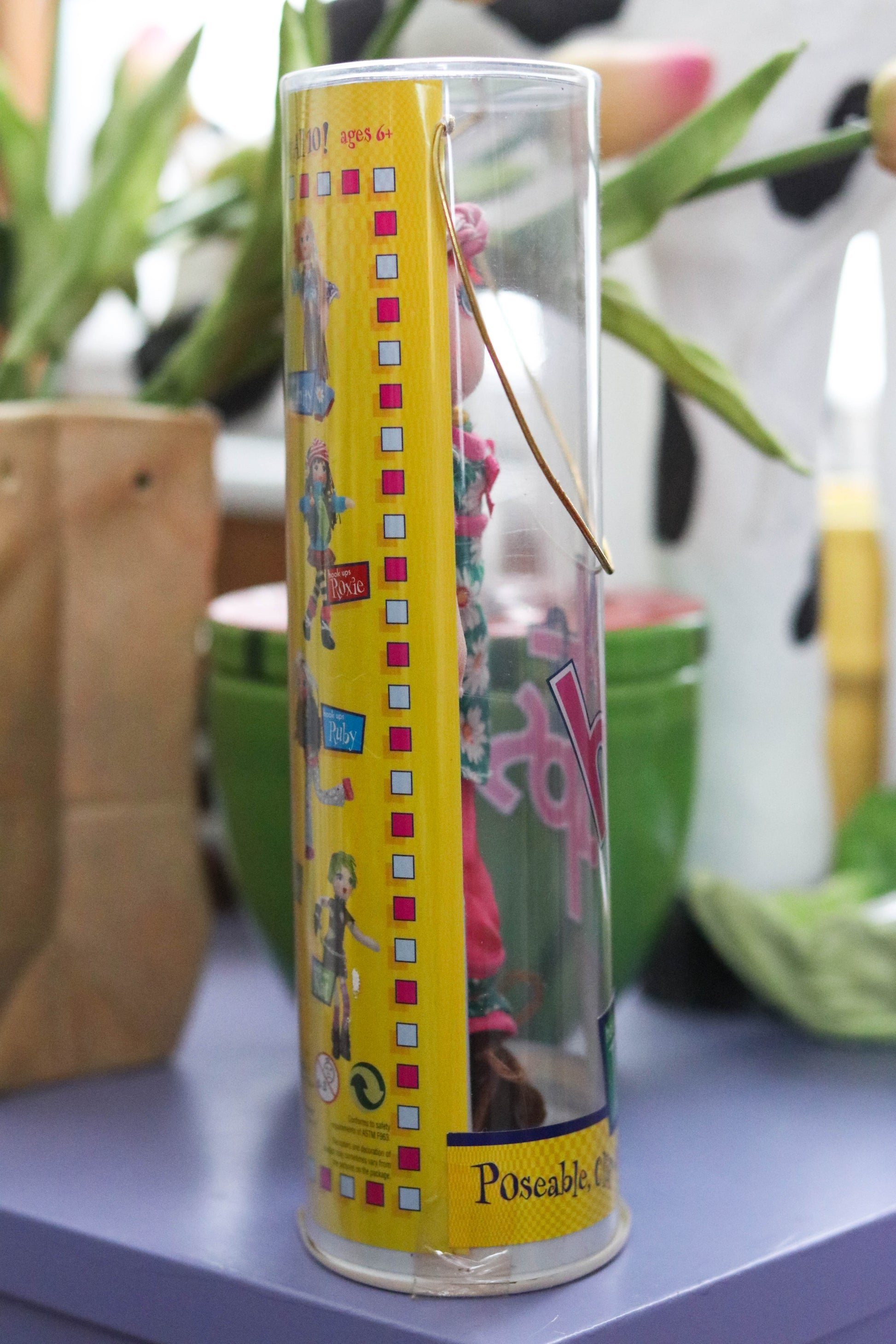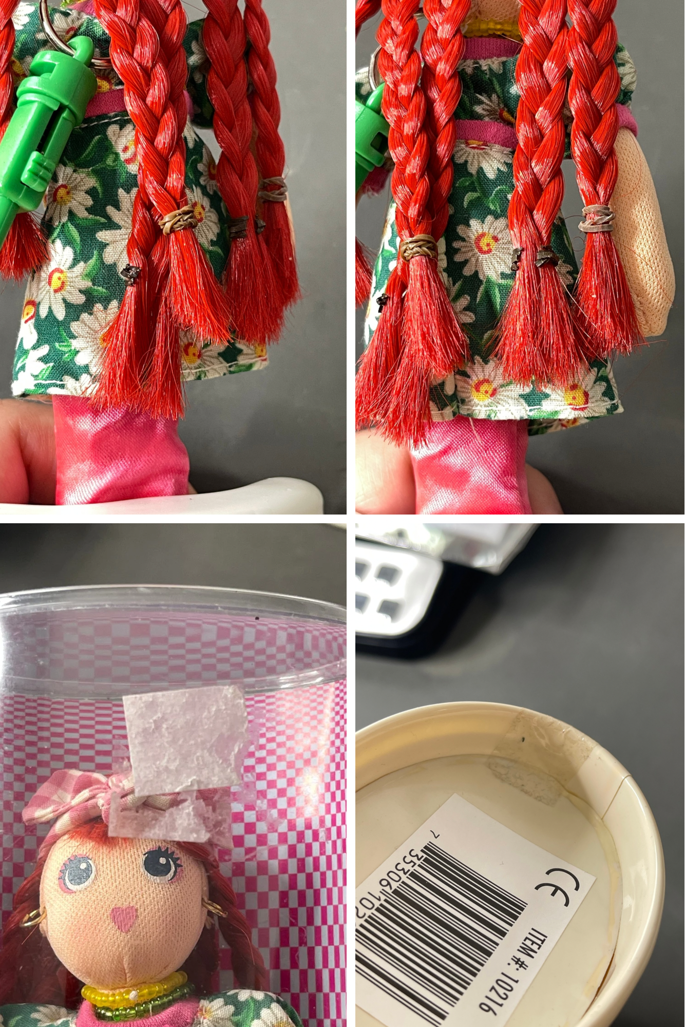 • New, it appears the bottom of the packaging was opened before. (before me) The doll's hair bands snapped due to age, will need new rubber bands, her braids are coming un-done. Please see photos. The packaging has wear due to storage. The plastic packaging also has some sticker residue as seen in the photos.
