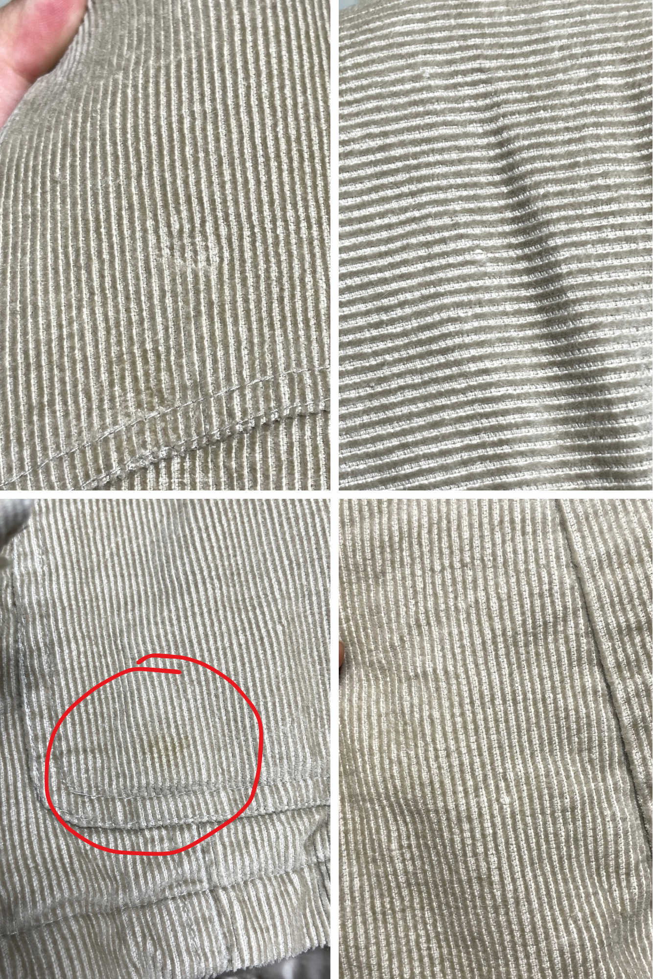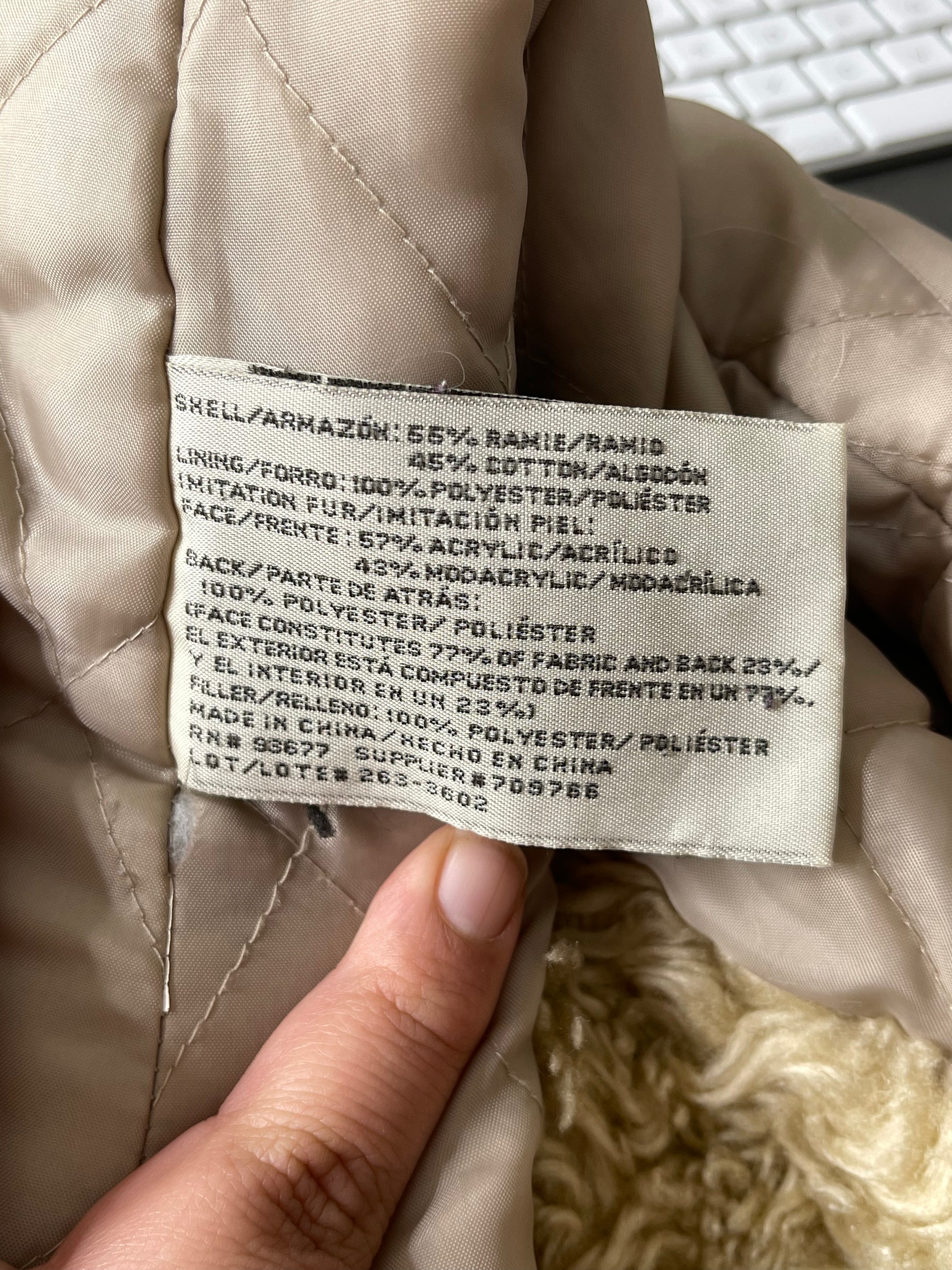• This jacket is in preloved worn condition, it has small scuffs, fabric marks, stains and worn areas. The jacket has a yellow stain near the front pocket. The jacket isn't fully lined with sherpa, only the trim of the front. The lining has a small rip near the care tag.