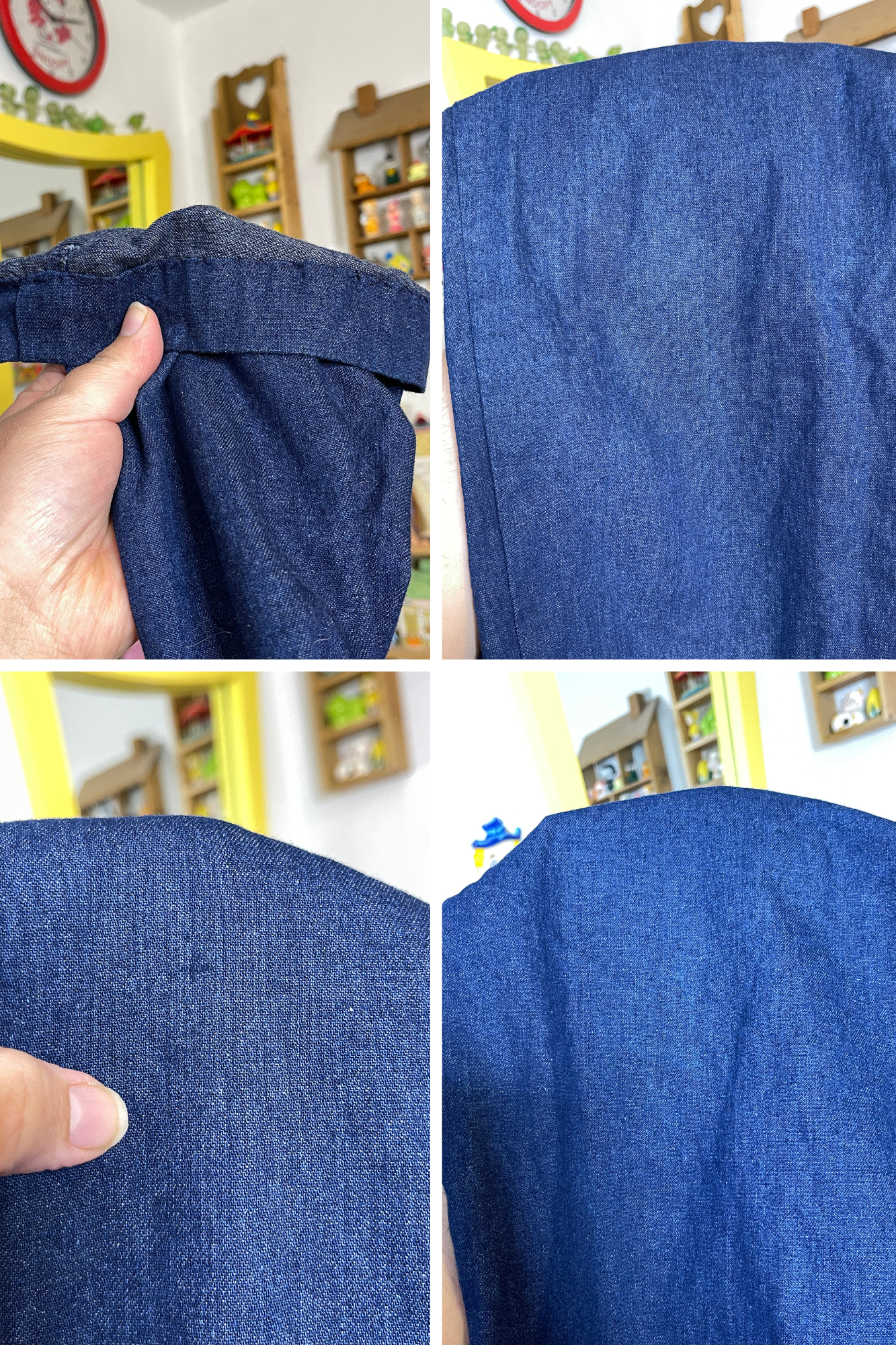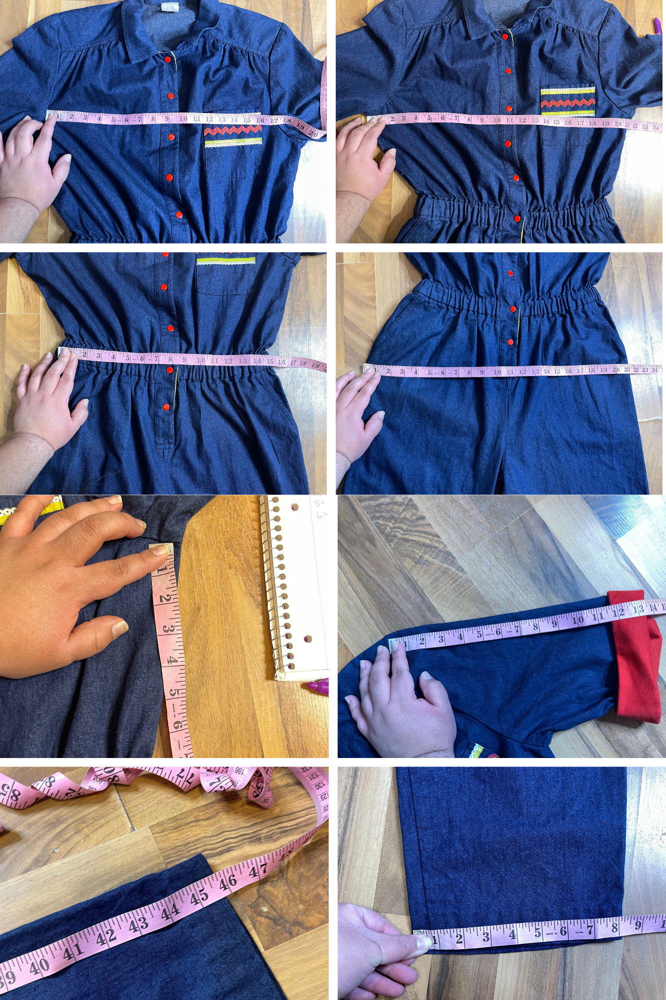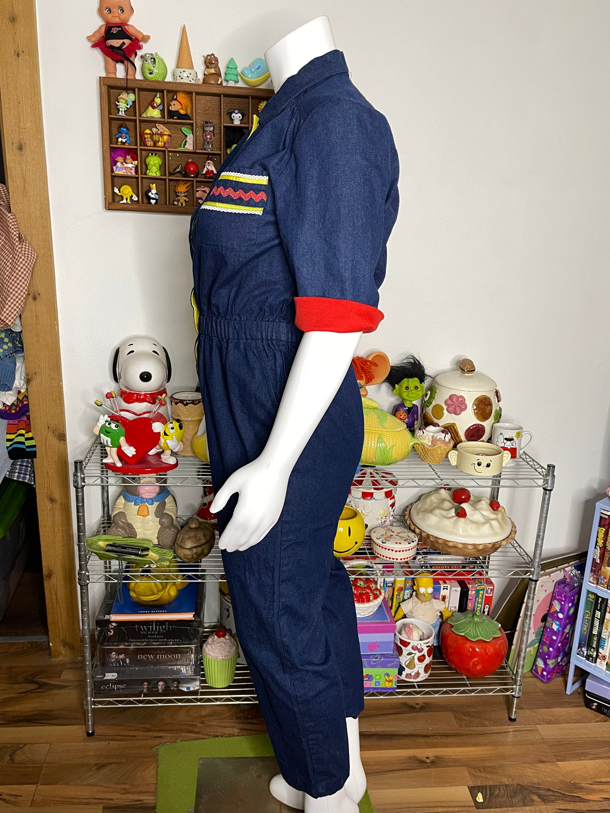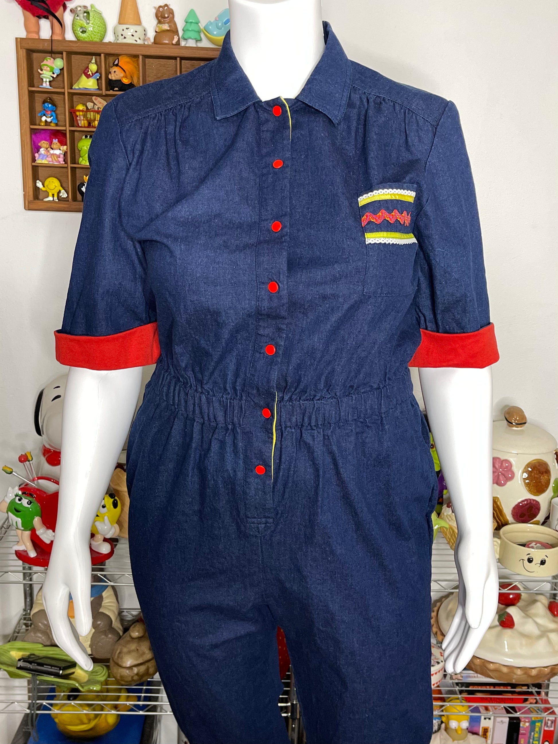 • Has shoulder pads, but you can always remove them. The waist has elastic, the rest of the item does not have much stretch. (sorta light weight fabric) The jumper is In vintage preloved condition, worn and faded. It has some discoloration on the front knee area & back thighs. The denim also has scuffs. The previous owner hemmed the item, not 100% perfect but it can be undone.