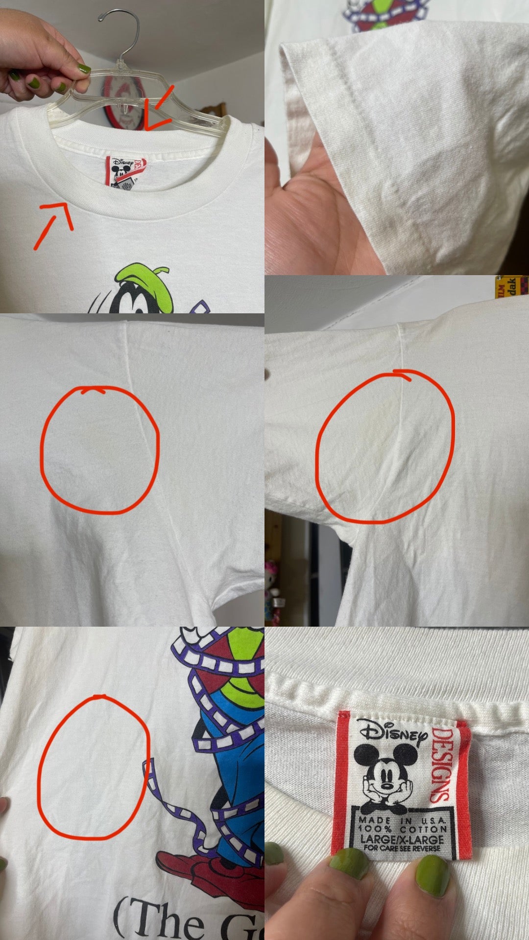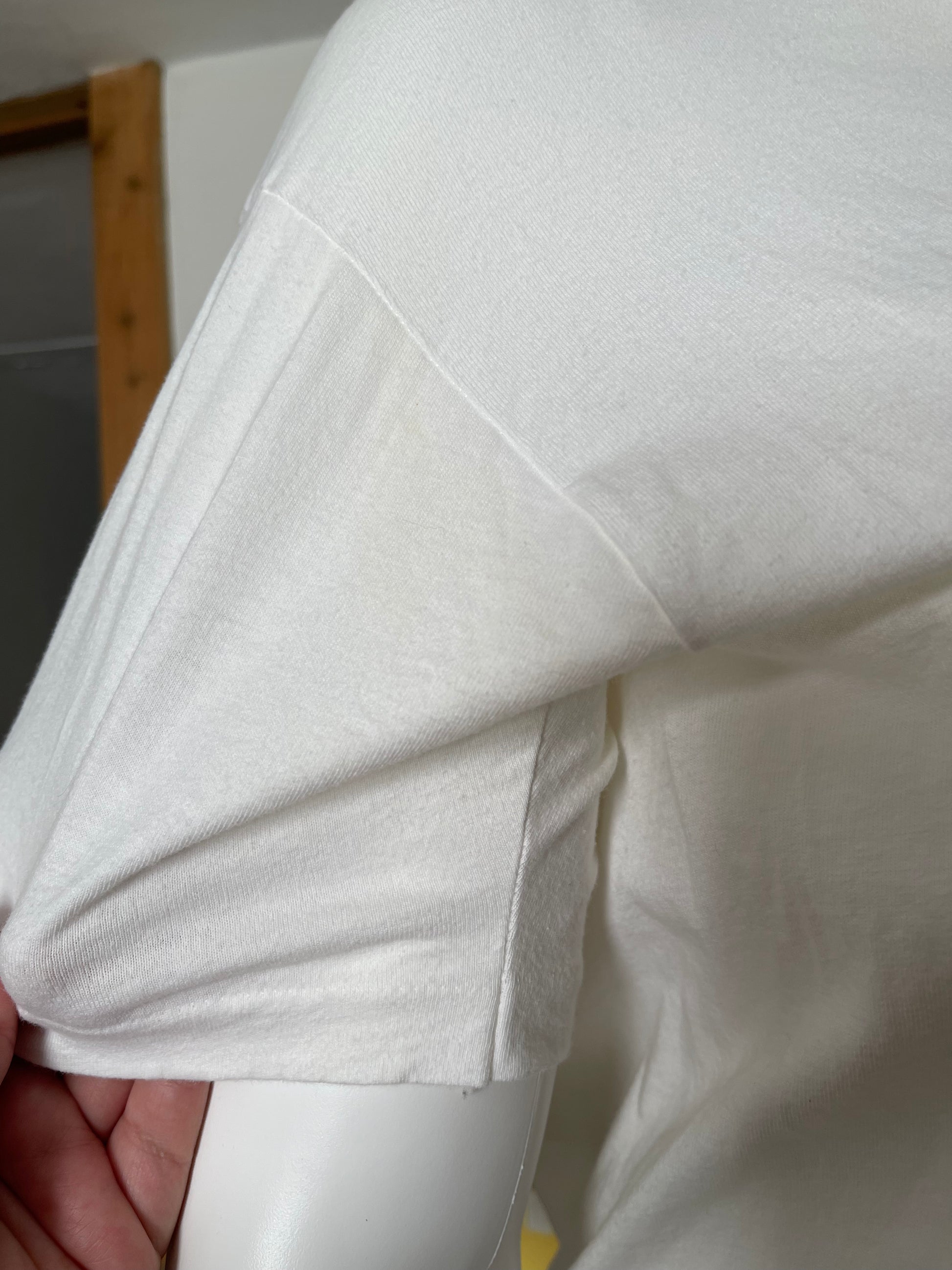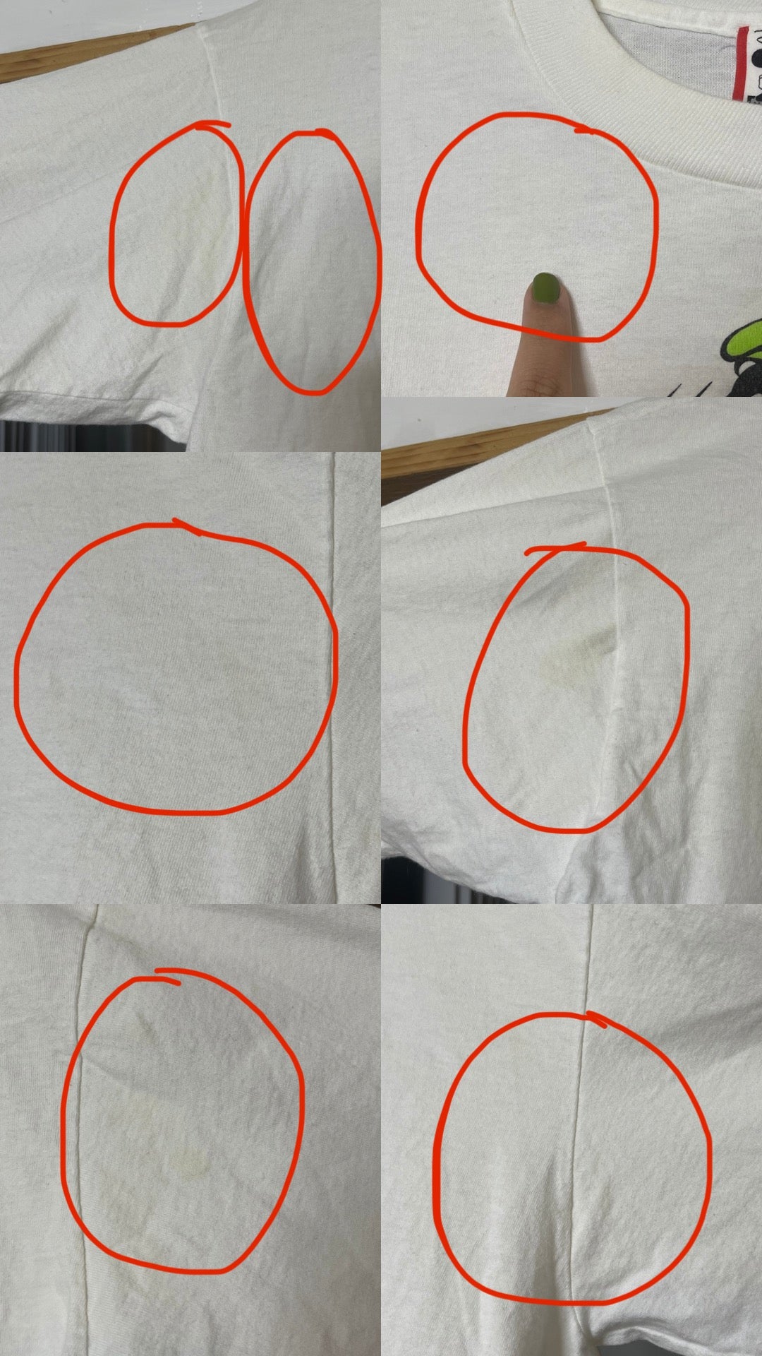 • This tee is in worn / vintage condition. It's fading and has pilling throughout the fabric, the tee also has several yellow stains (near both pits / around pit area / on the back of both of the sleeves) The neck is also yellowing. (pits are stained)