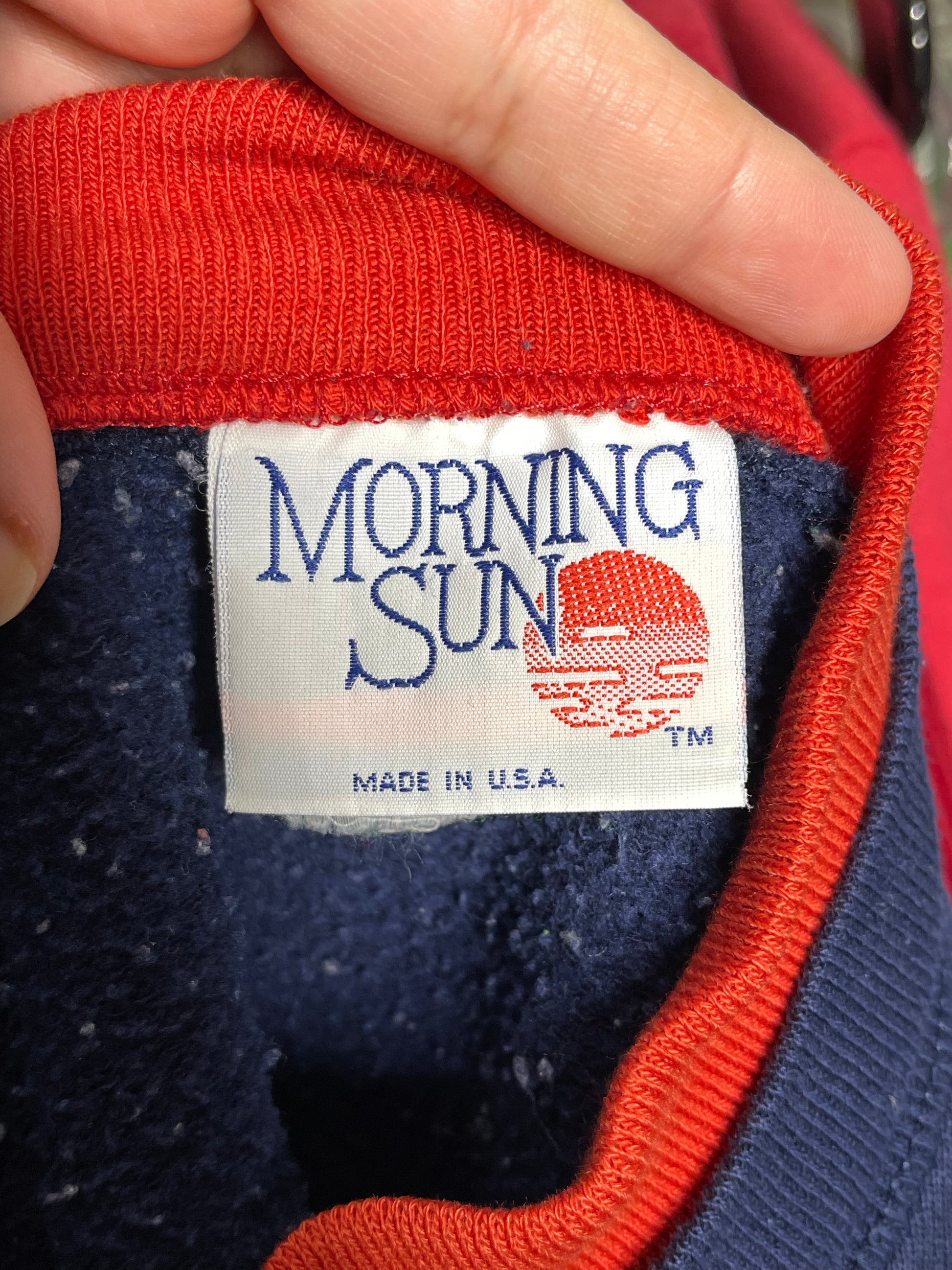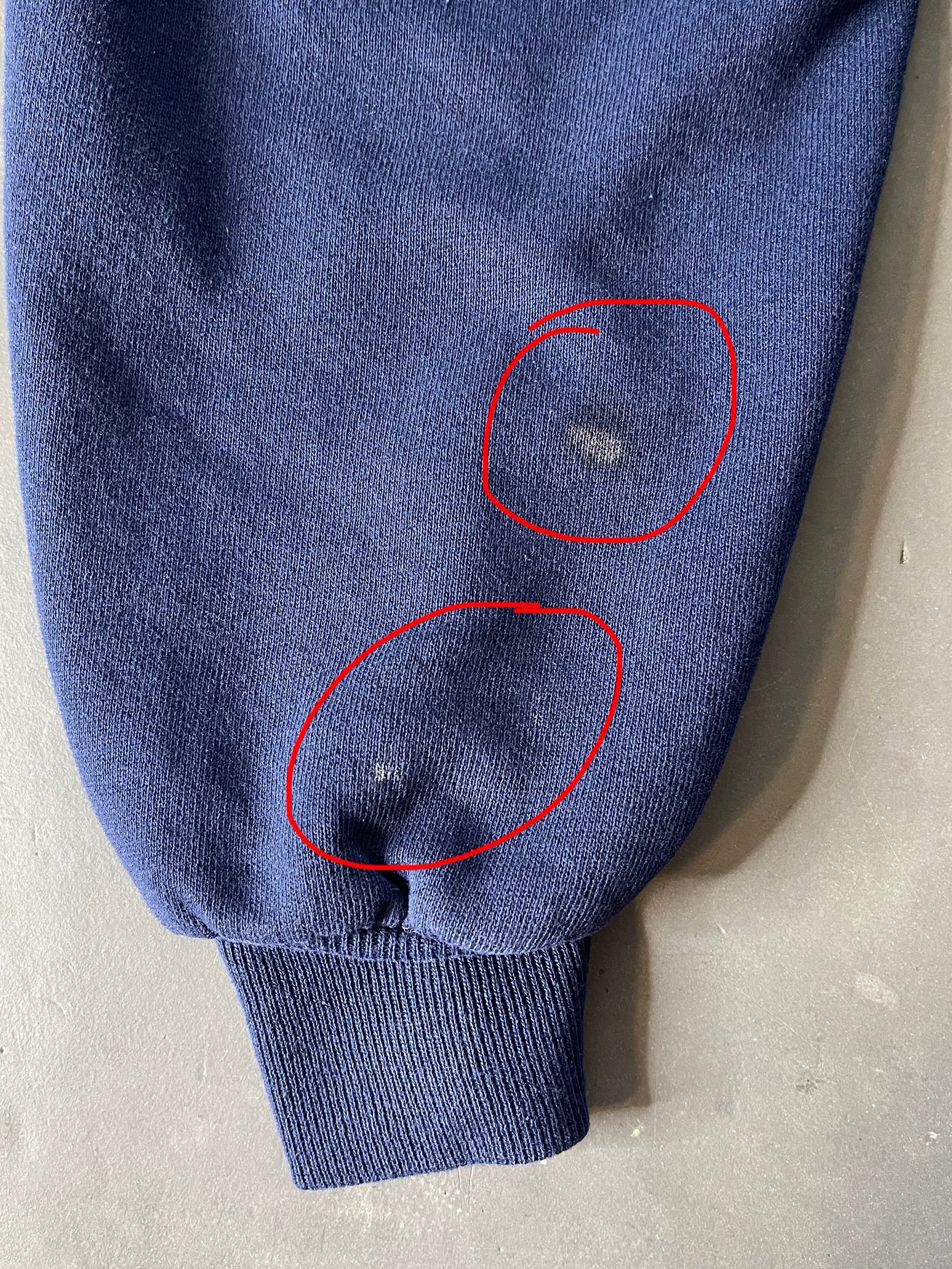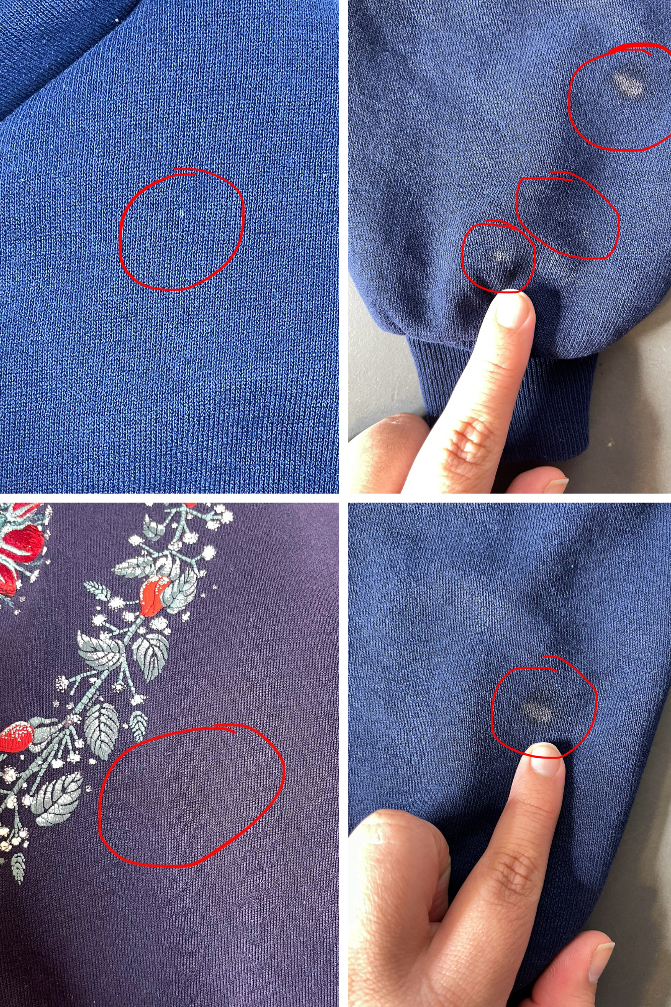 • The sweater is in worn & flawed condition, it has fading and pilling throughout the fabric. Faded and worn, it has several stains. One tiny bleach stain on the front, a dark stain near the artwork & several "bleach" stains on the back sleeve. (Please look at all the photos) The sweater has embroidery and screen printed roses.