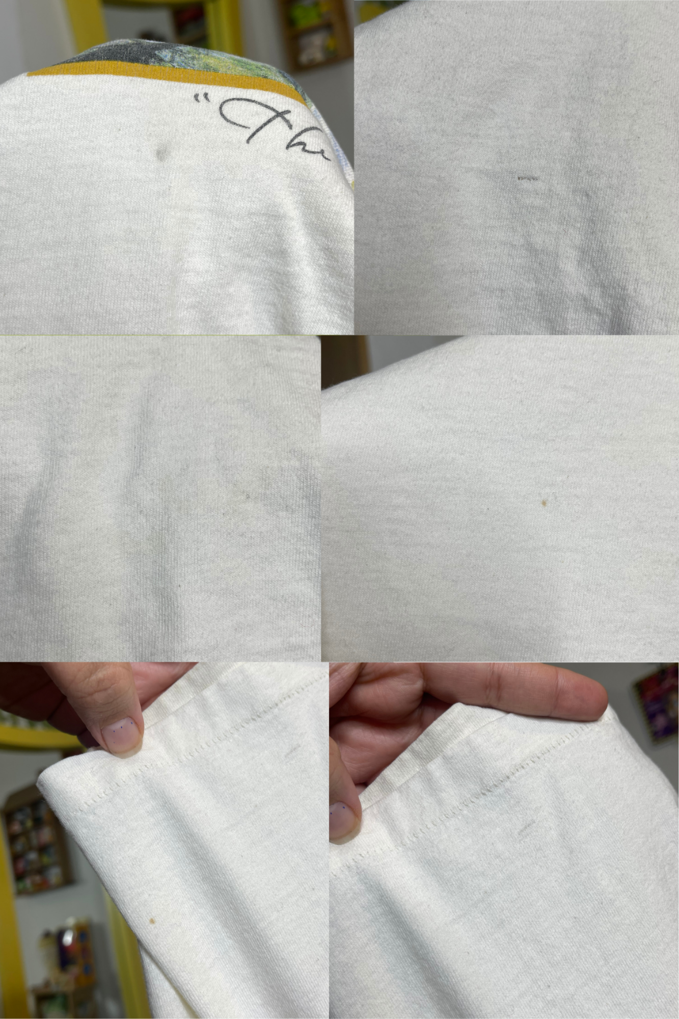 • The tee is in preloved worn condition. It is worn and faded, the tee also has tons of dark / yellow stains. I was unable to remove the stains.