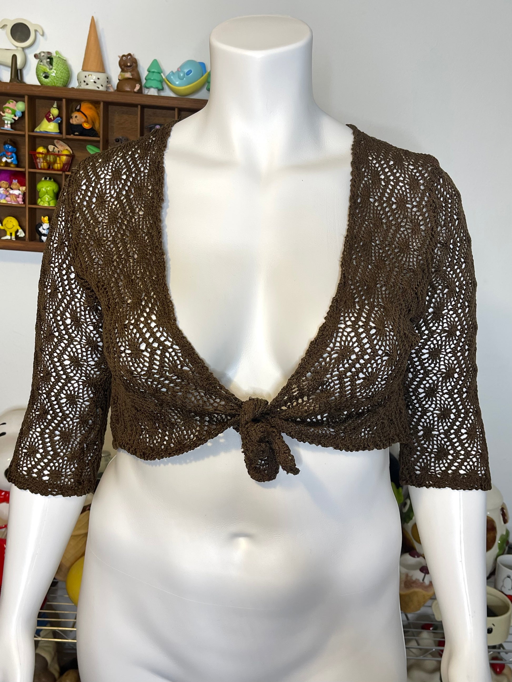 Brown Crochet Tie-Front Cropped 3/4 Sleeve Cardigan Sz L
