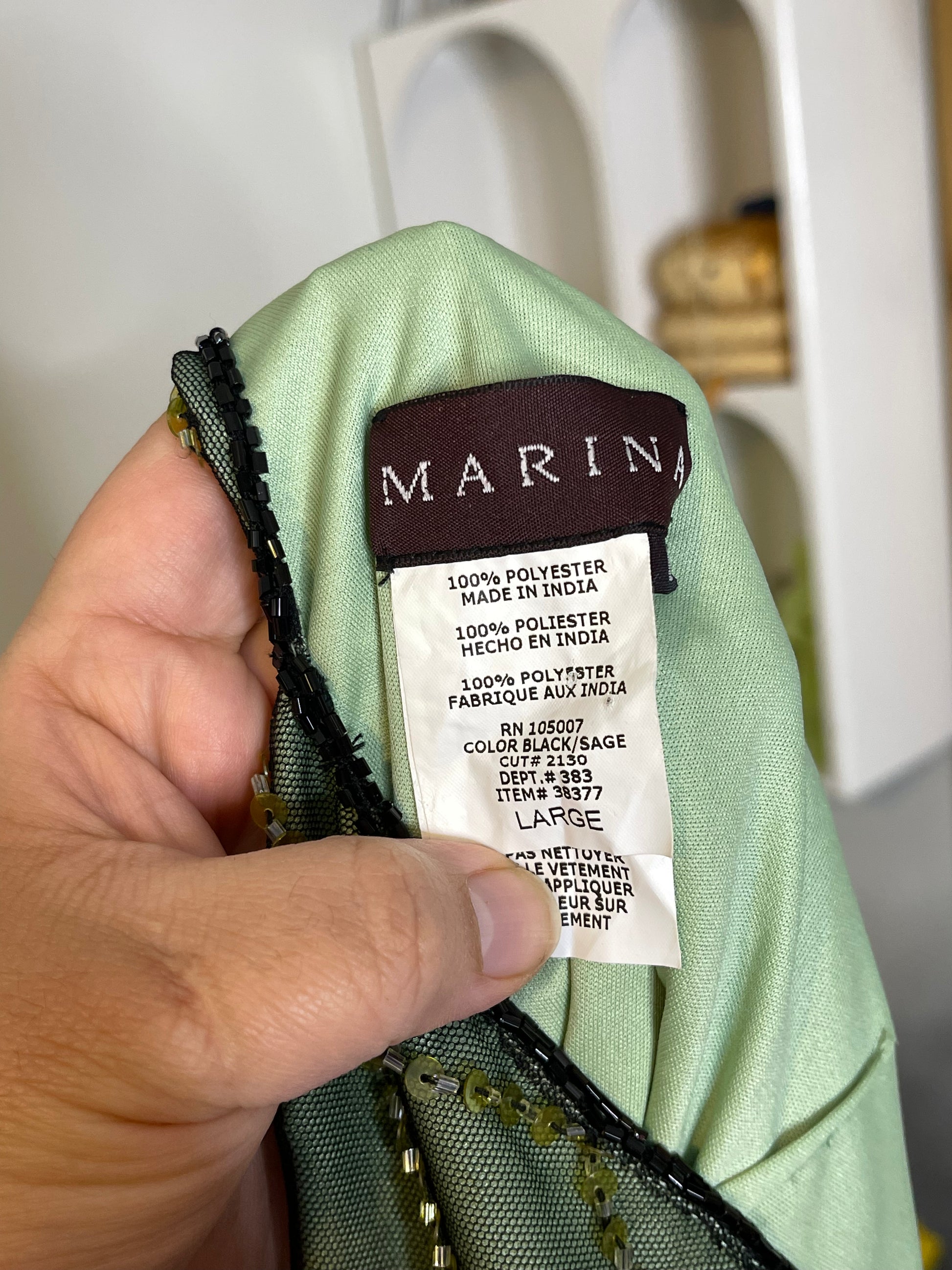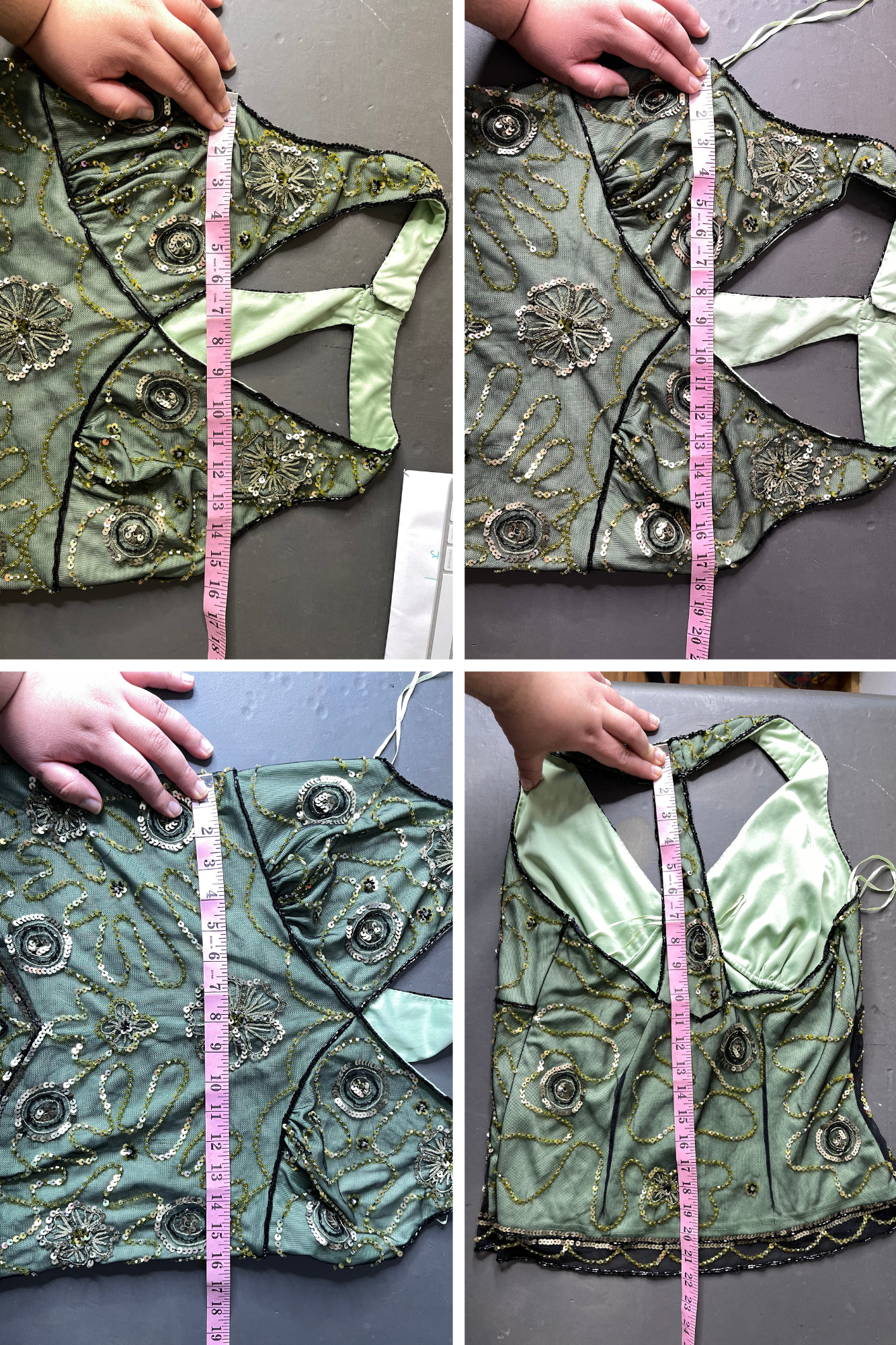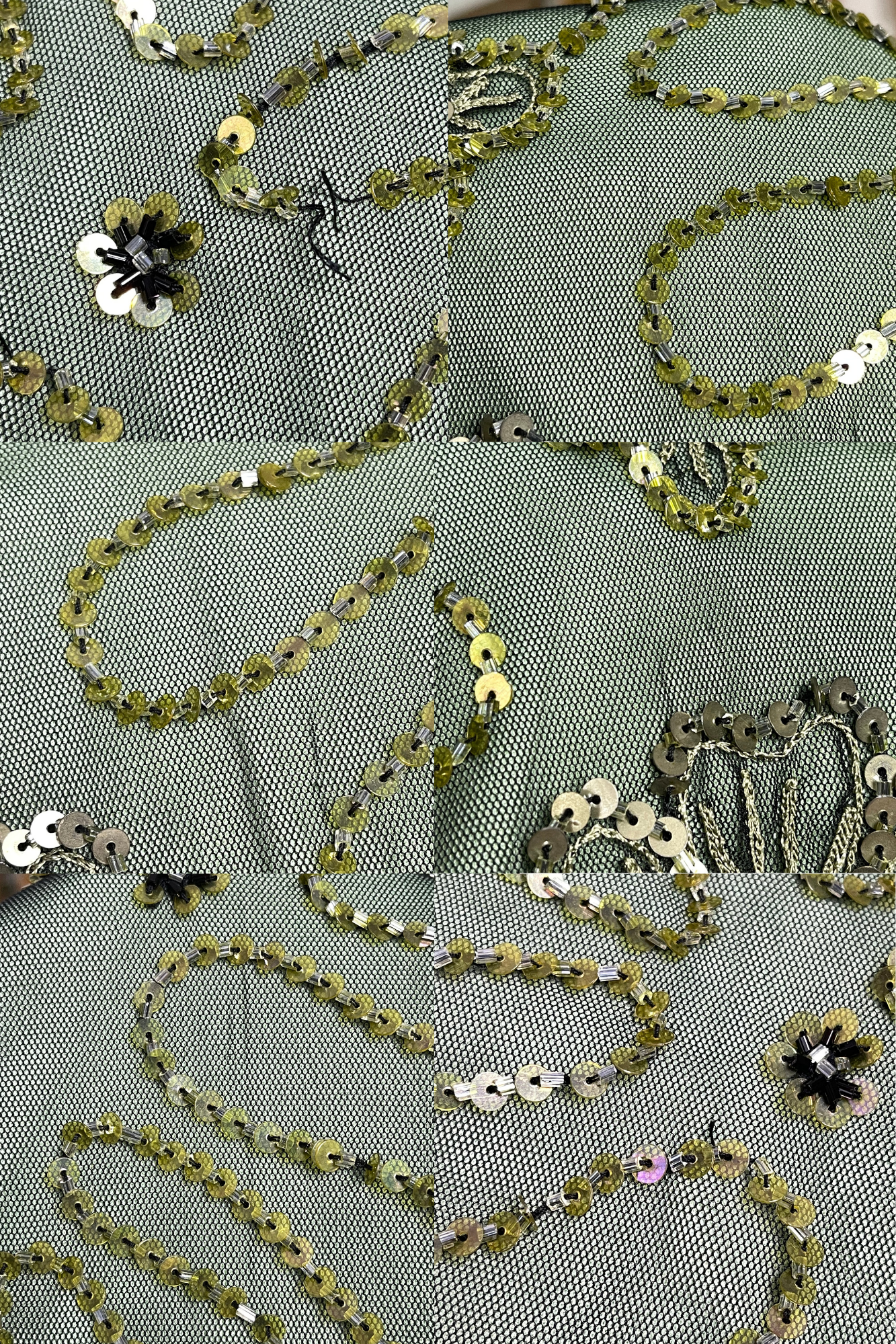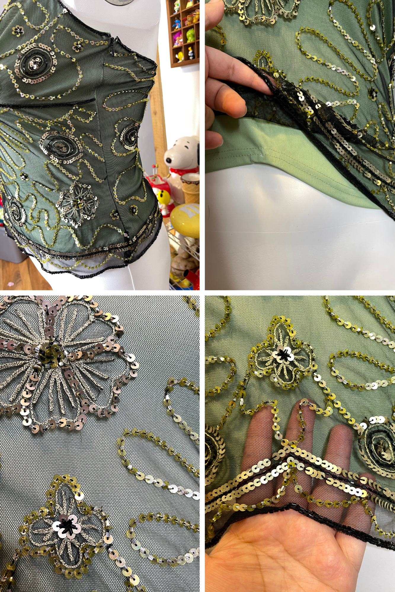 • The fabric does not have much stretch, it's lined with green fabric. It has a zipper on the side, the top is in preloved worn condition. It has several missing beads & sequins, several sequins also have scuffs and wear. The mesh on the back has 2 small holes, the mesh also has snags all over. The inner lining has some light stains, Please look at all the photos.