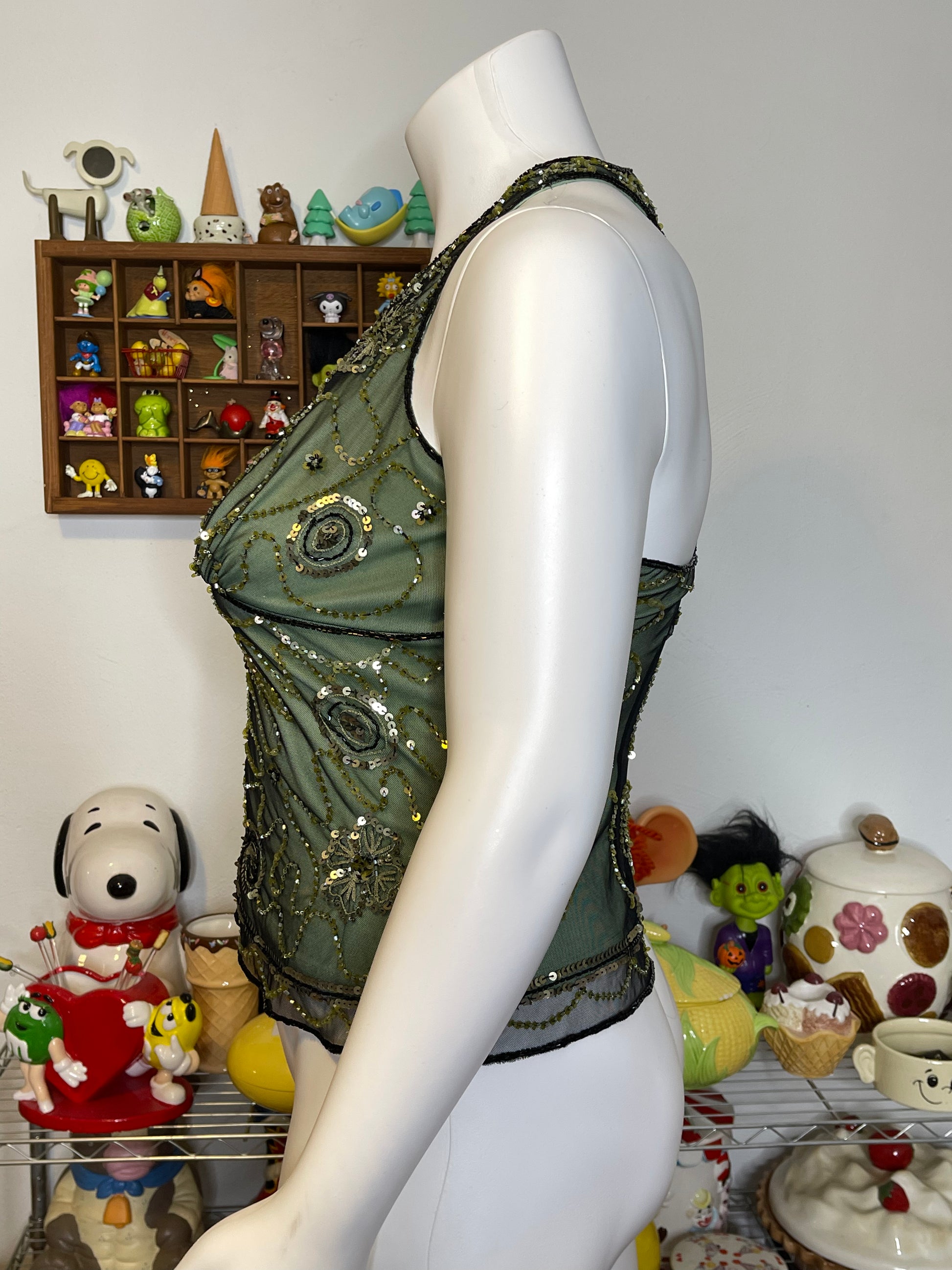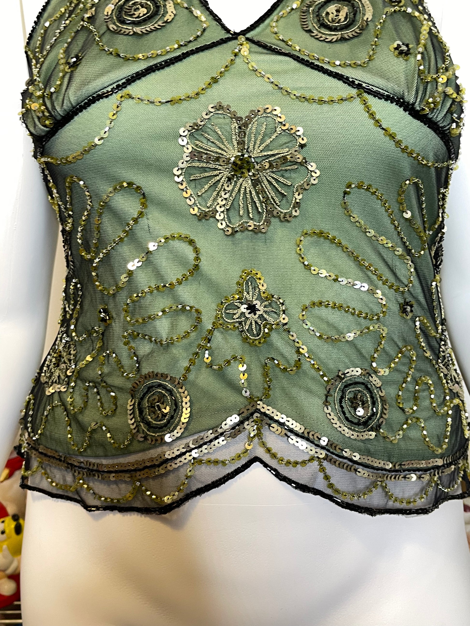 Vintage 2000s Green Beaded & Sequin Mesh Halter Top