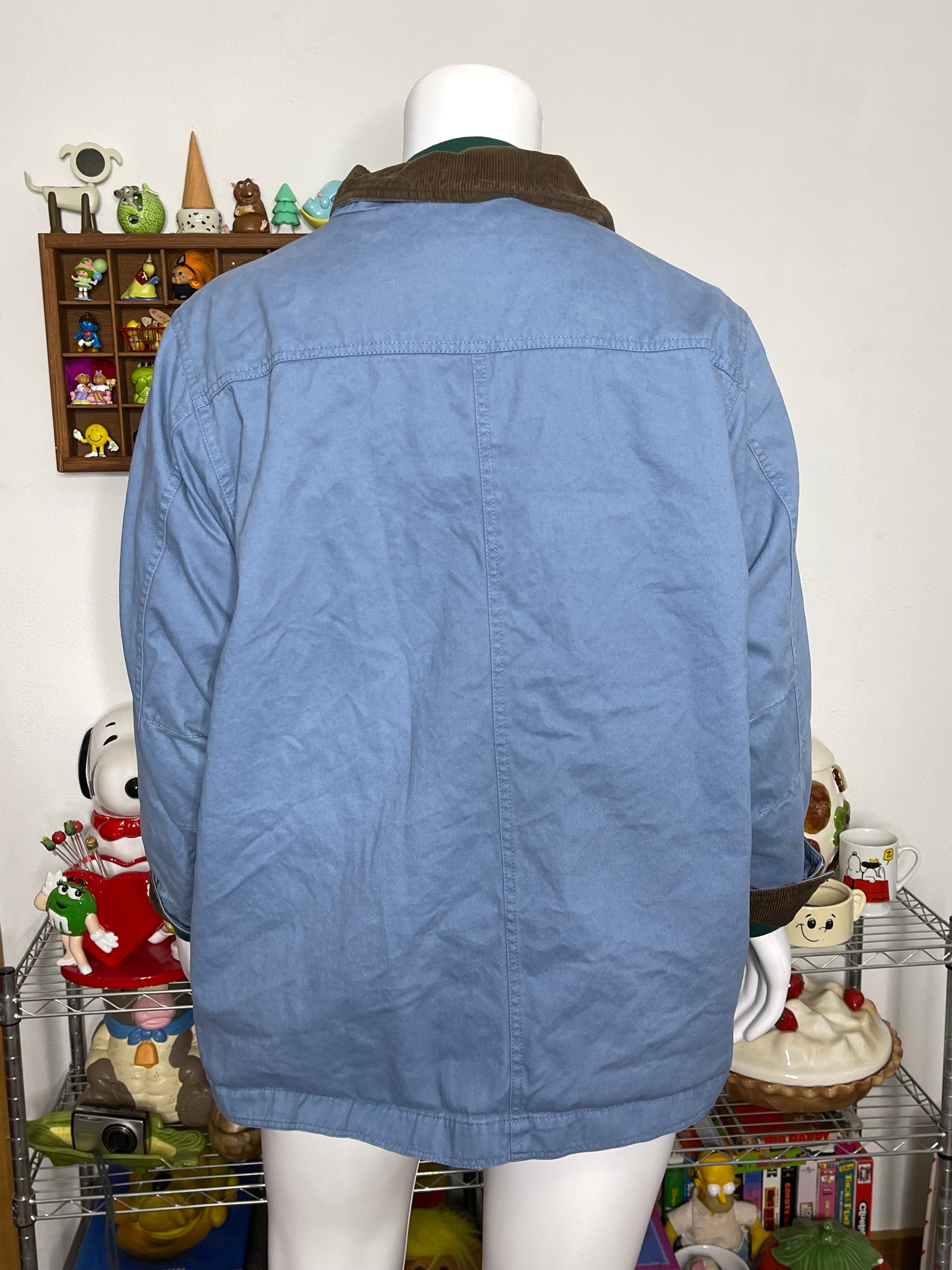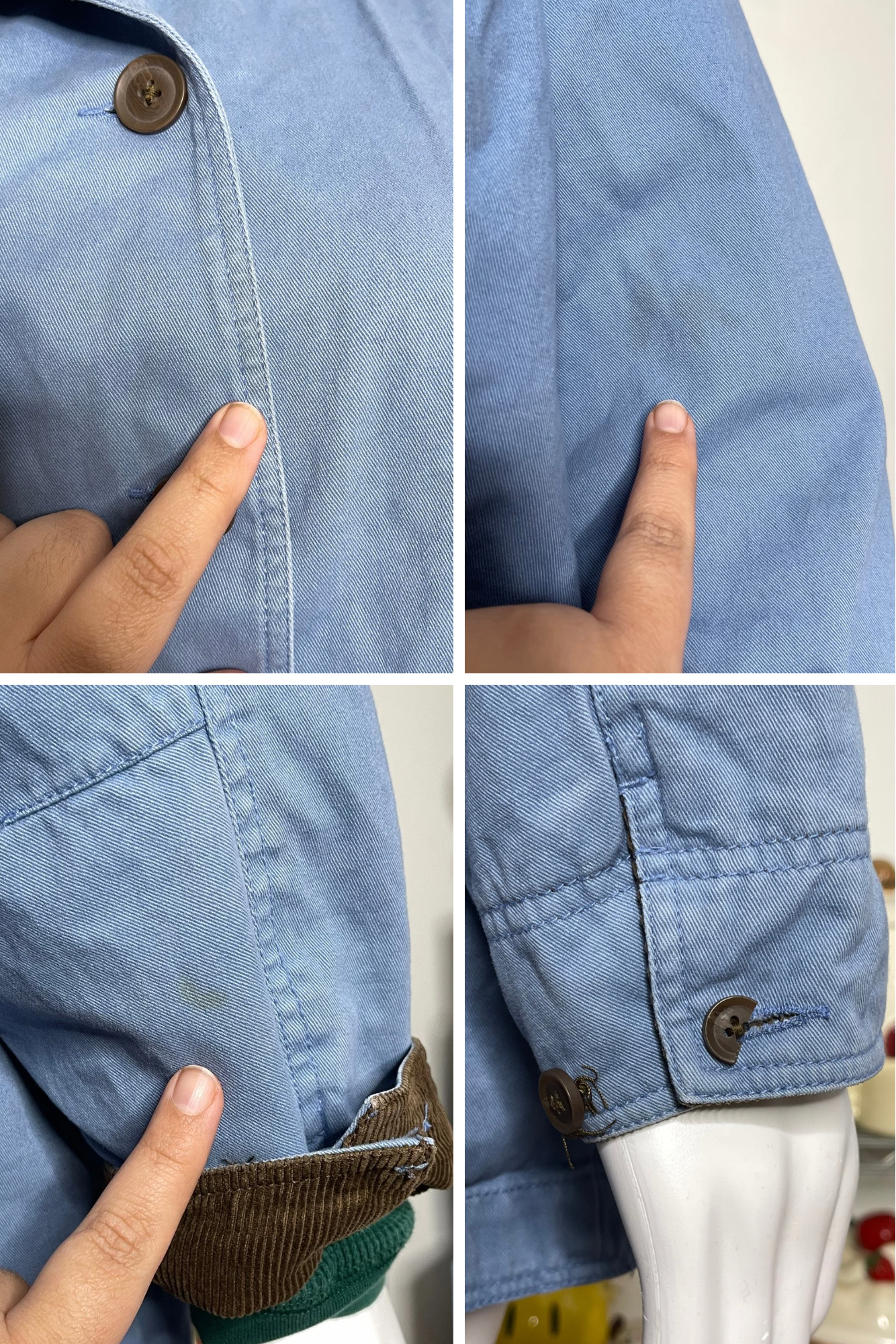 • This jacket is light weight, not heavy. Perfect for layering! The jacket is lined with floral fabric. The jacket is in worn, faded & flawed condition, it has tons of stains all over, the sleeve button is also broken as seen in the photos. I think some of the stains on the back shoulder are bleach stains? Please look at all the photos carefully.