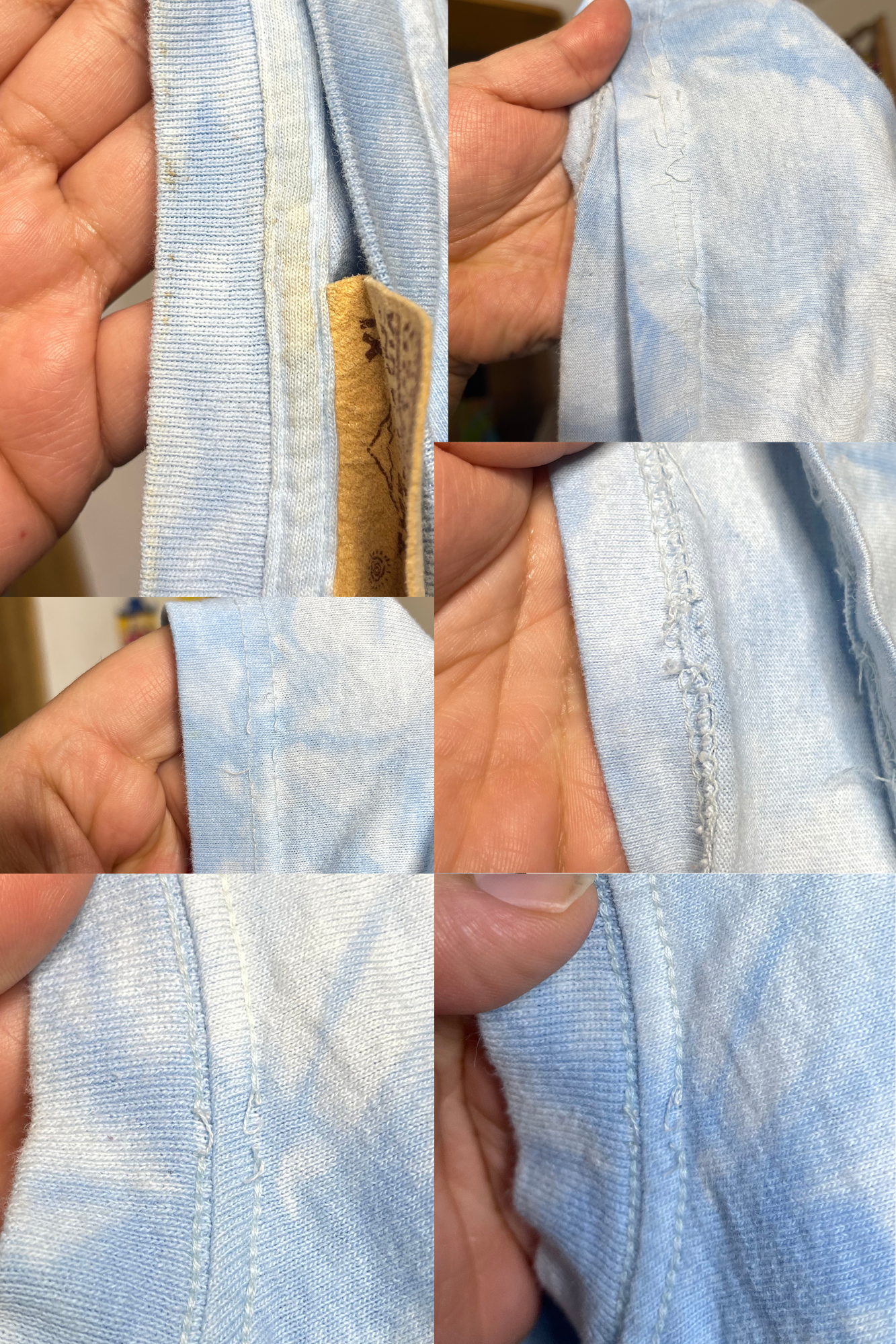 • This tee is in preloved condition, it's worn and a bit faded. The back of the inner neck has some yellowing and several small stains, the front and back bottom seem has loose/missing stitching. Please look at all the photos.