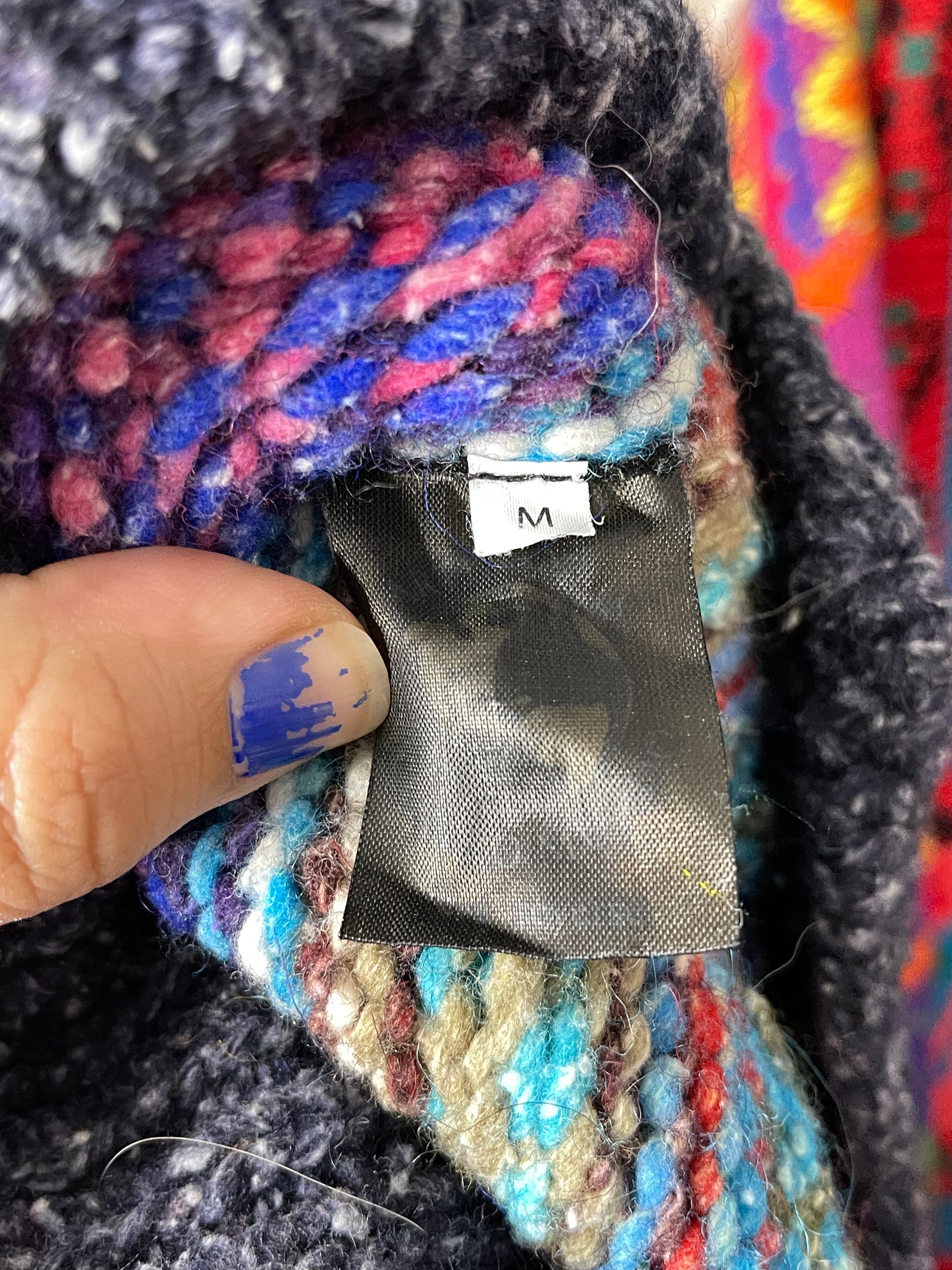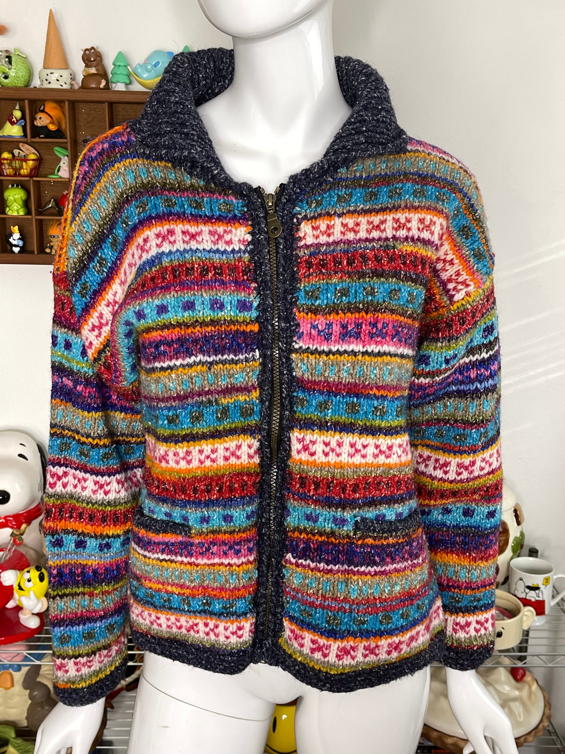 Vintage Colorful Hand Knit Wool Blend Zip-Up Sweater Sz M