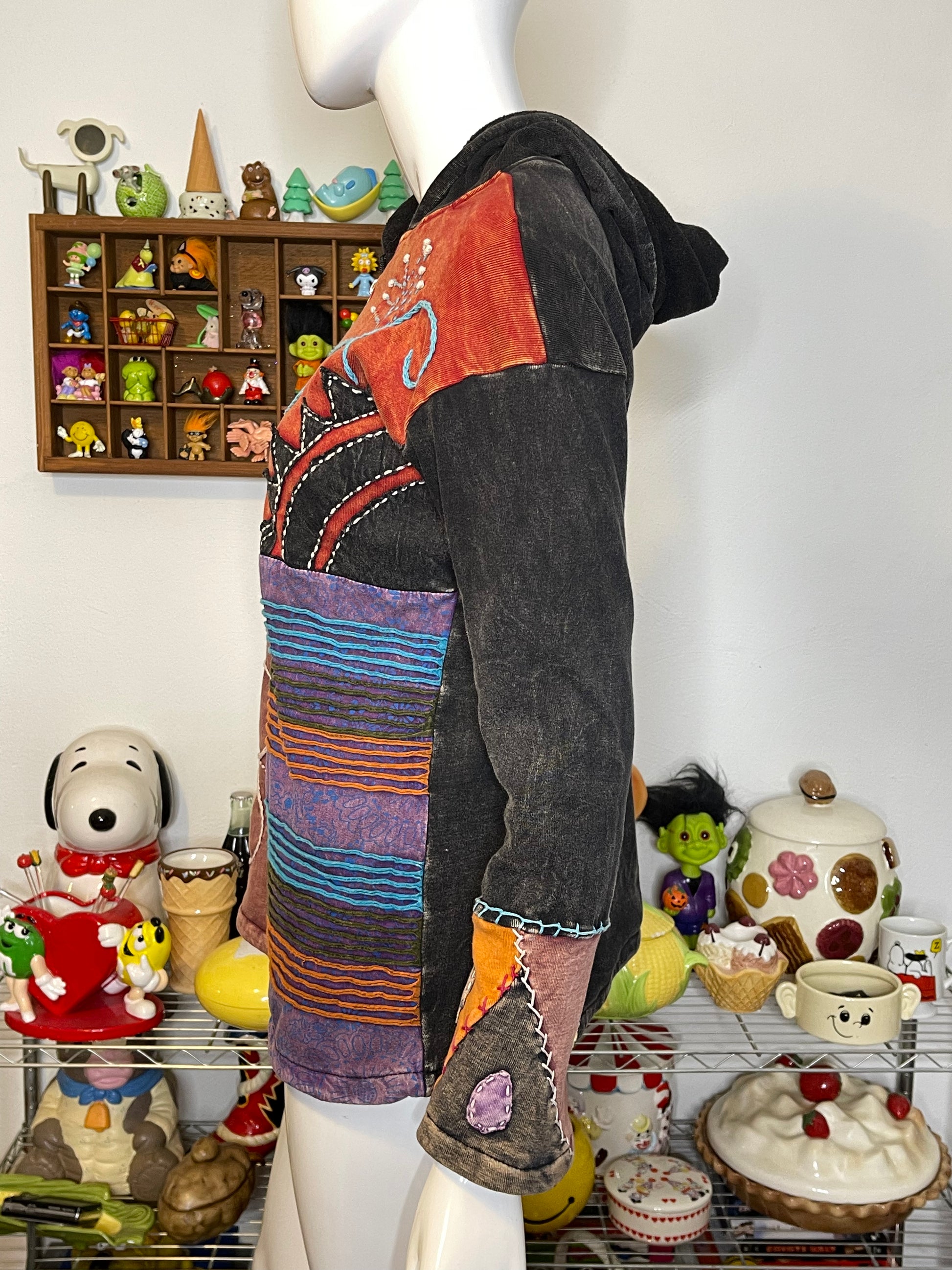 Tie-dye Patchwork Flowers Fleeced Lined Hoodie Sz M