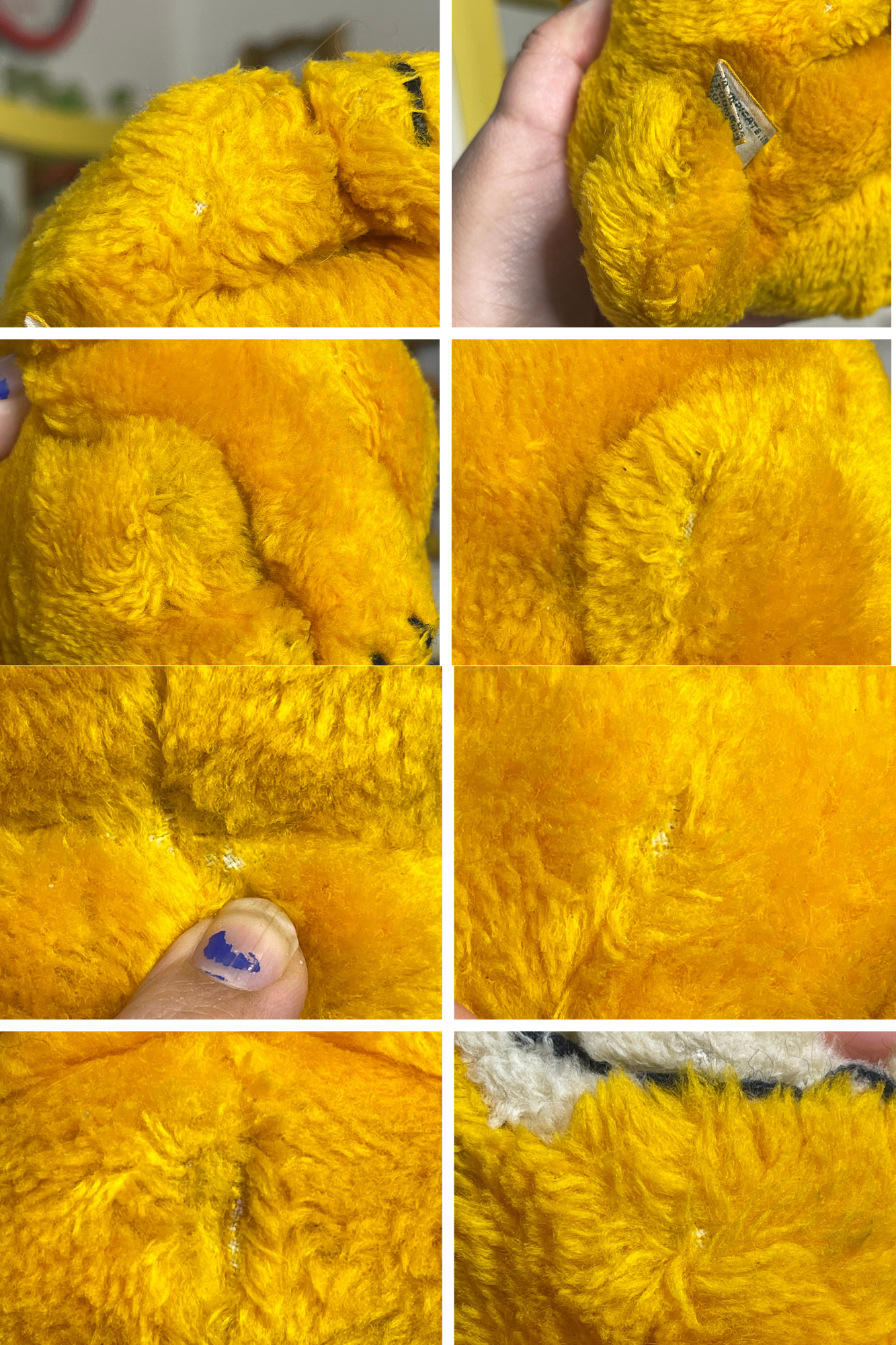 • In vintage condition, his face has some wear as seen in the photos (chipping and scratches on his nose + eyes.) He is also missing fur in several places, his fur is a bit messy from handwashing. His fur also has some dark areas.
