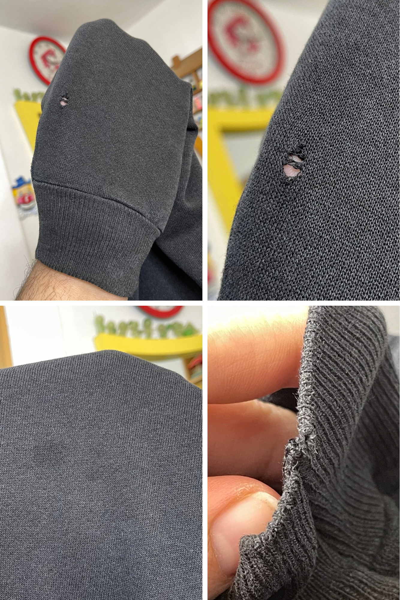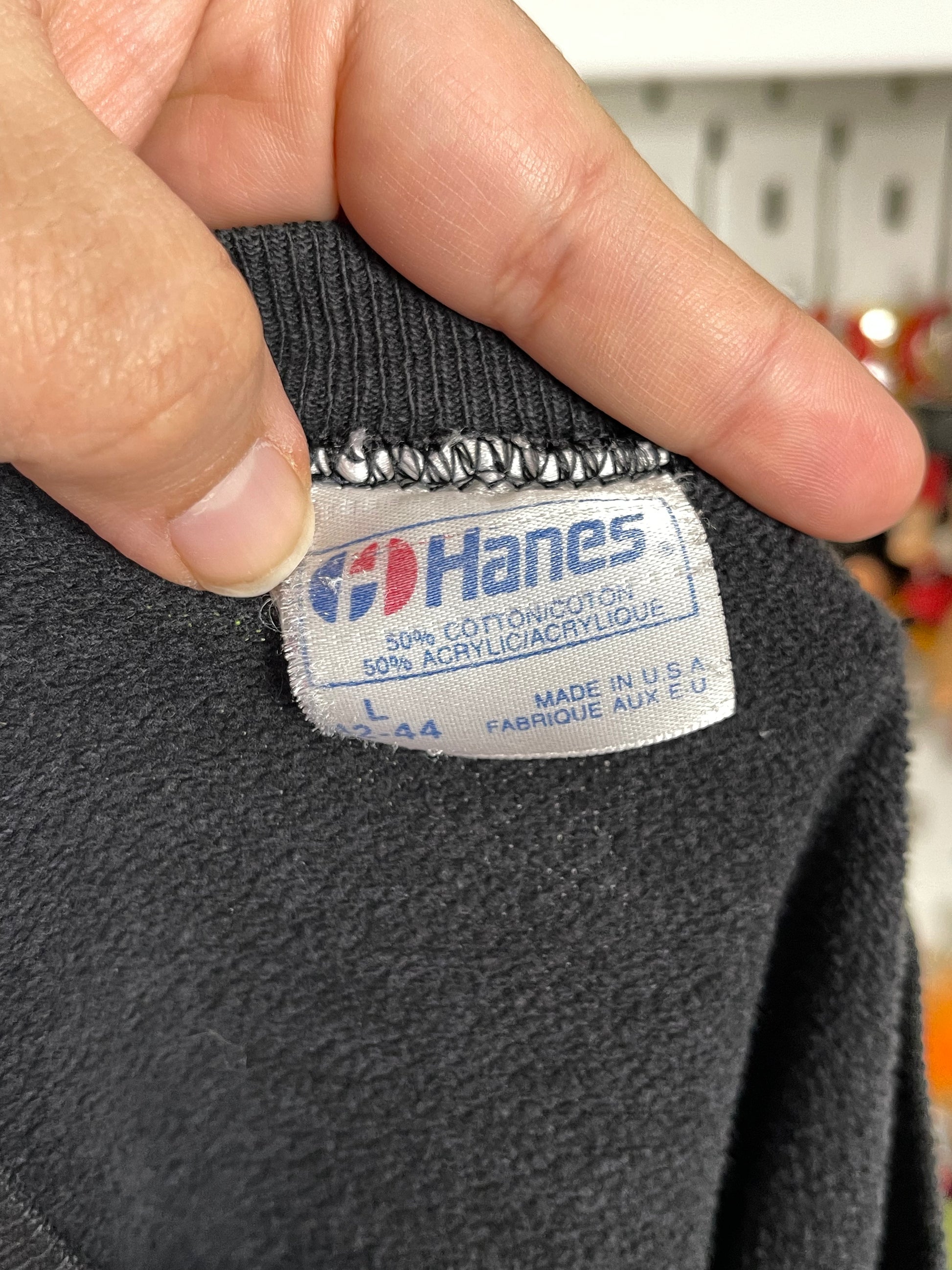 • This sweater is in vintage worn condition, its very faded. The artwork also has tons of cracking due to wear. The sleeves have distressing, the back of one sleeve also has a hole (see photos) The back of the sweater also has several dark stains.