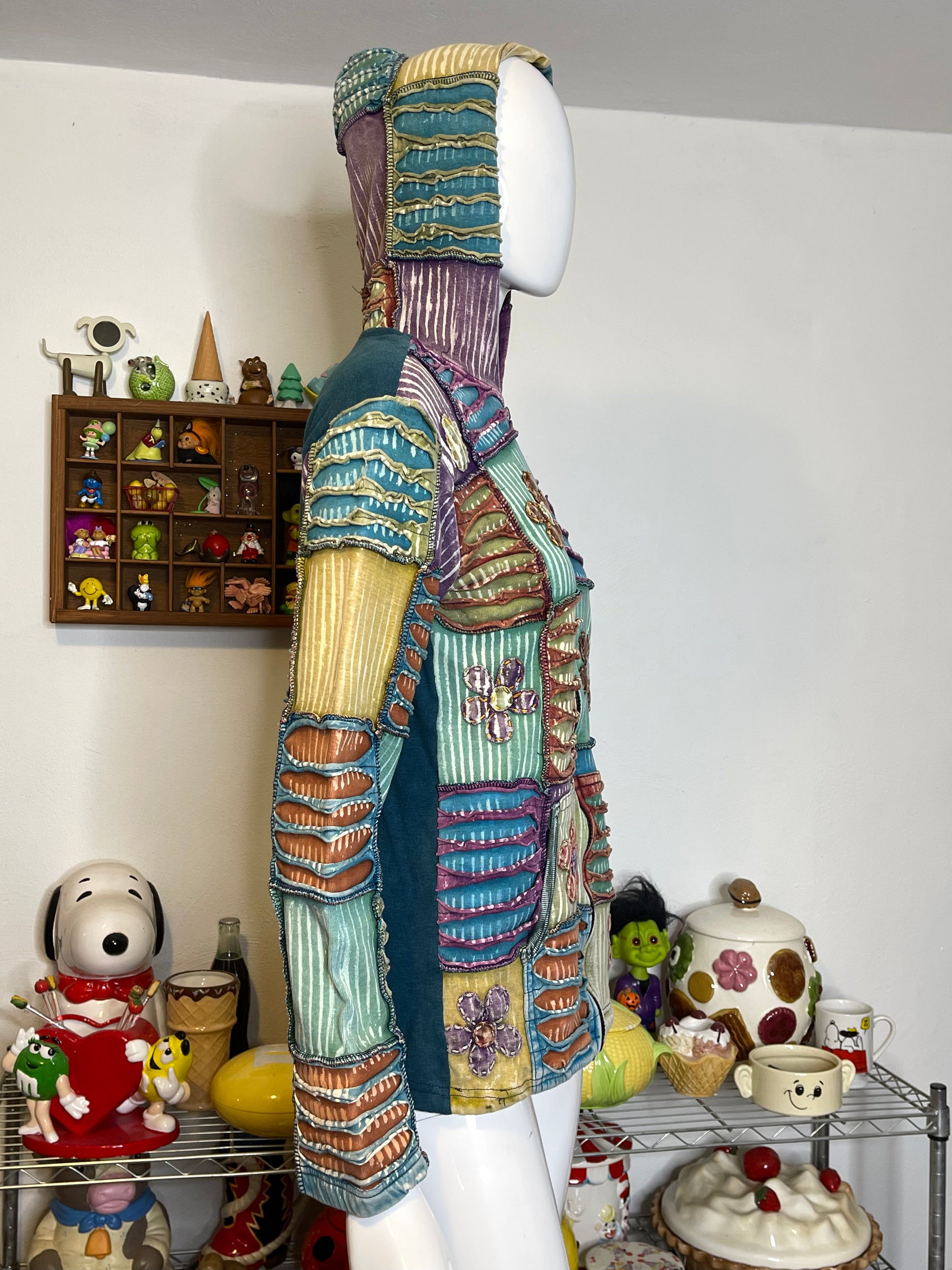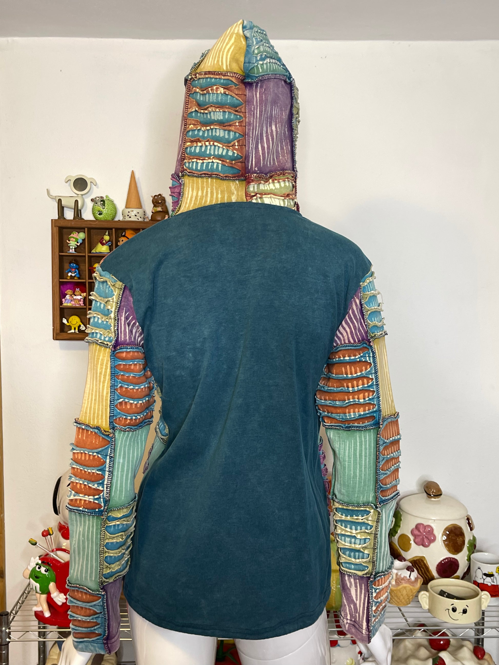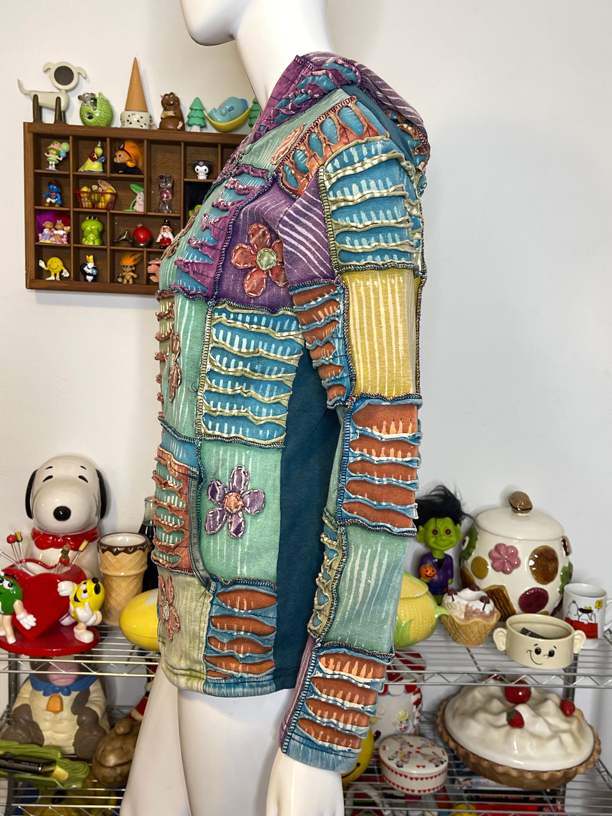 Tie-dye Patchwork Distressed Flowers Zip-up Hoodie Sz M/L