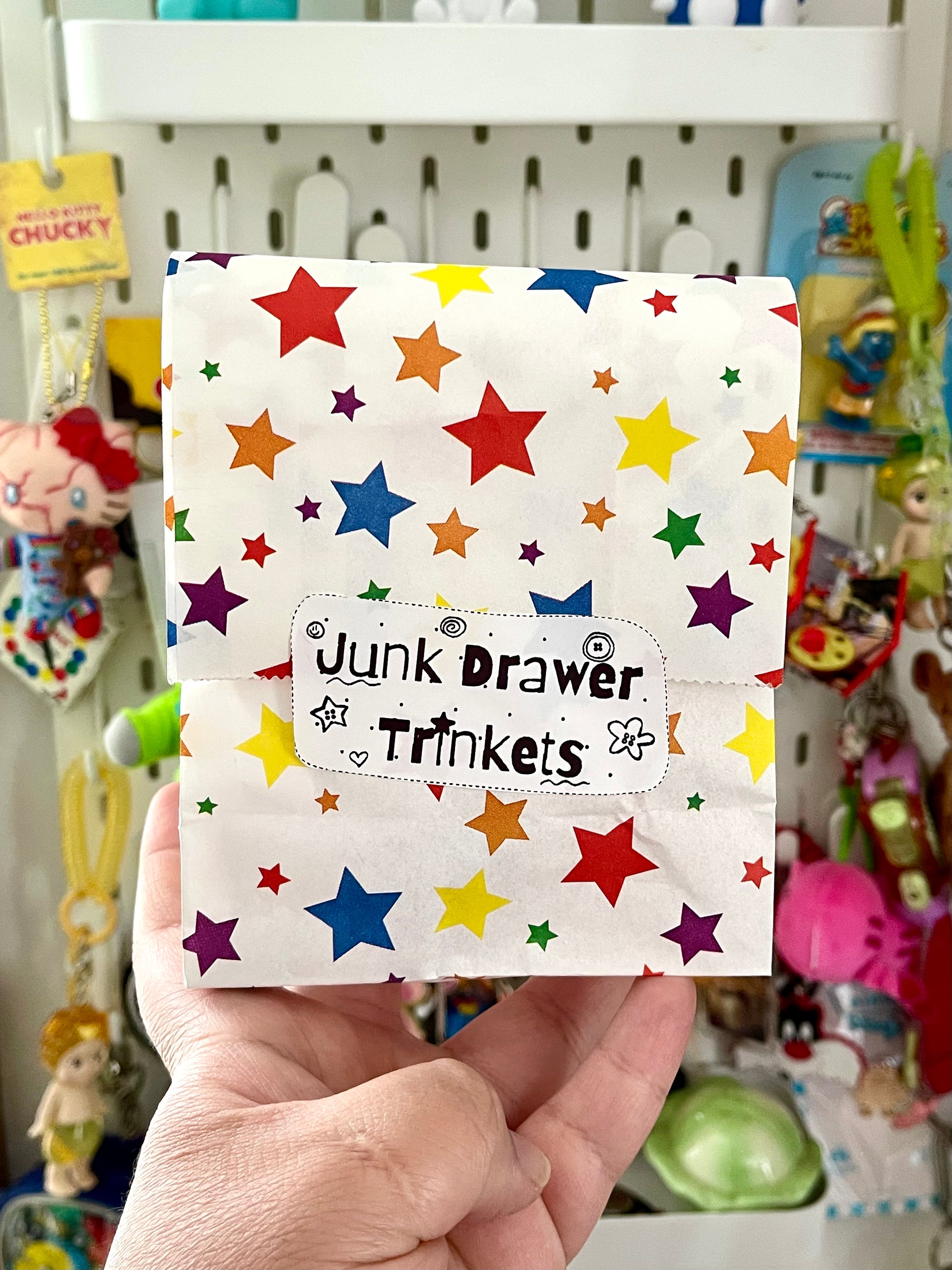 Did you have a junk drawer growing up? if you did, you most likely had the most random stuff in that drawer like (magnets, keychains and small toys). Well this is Vintage Peach's version, you will receive 5 random trinkets in a small bag. sorta like a blind bag because you don't exactly know what you will receive, but with more items!!