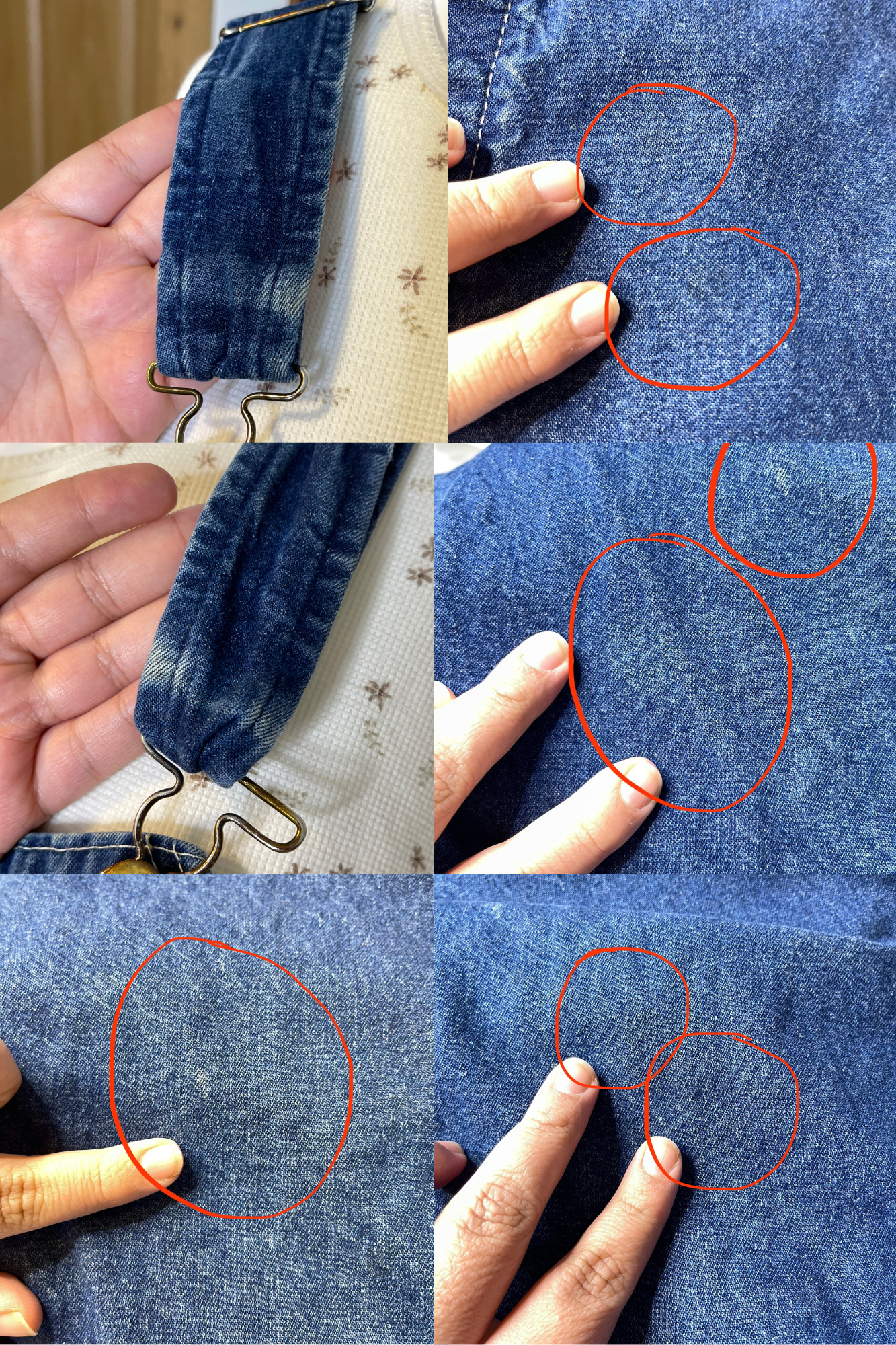 • In vintage preloved & "flawed" condition, the denim has wear, discoloration & scuffs. The overalls also have tons of dark yellow stains, some look like bleach stains (most of the stains on the front legs), the overalls are also yellowing from age. The straps have tons of discoloration as seen in the photos. Please look at all the photos.