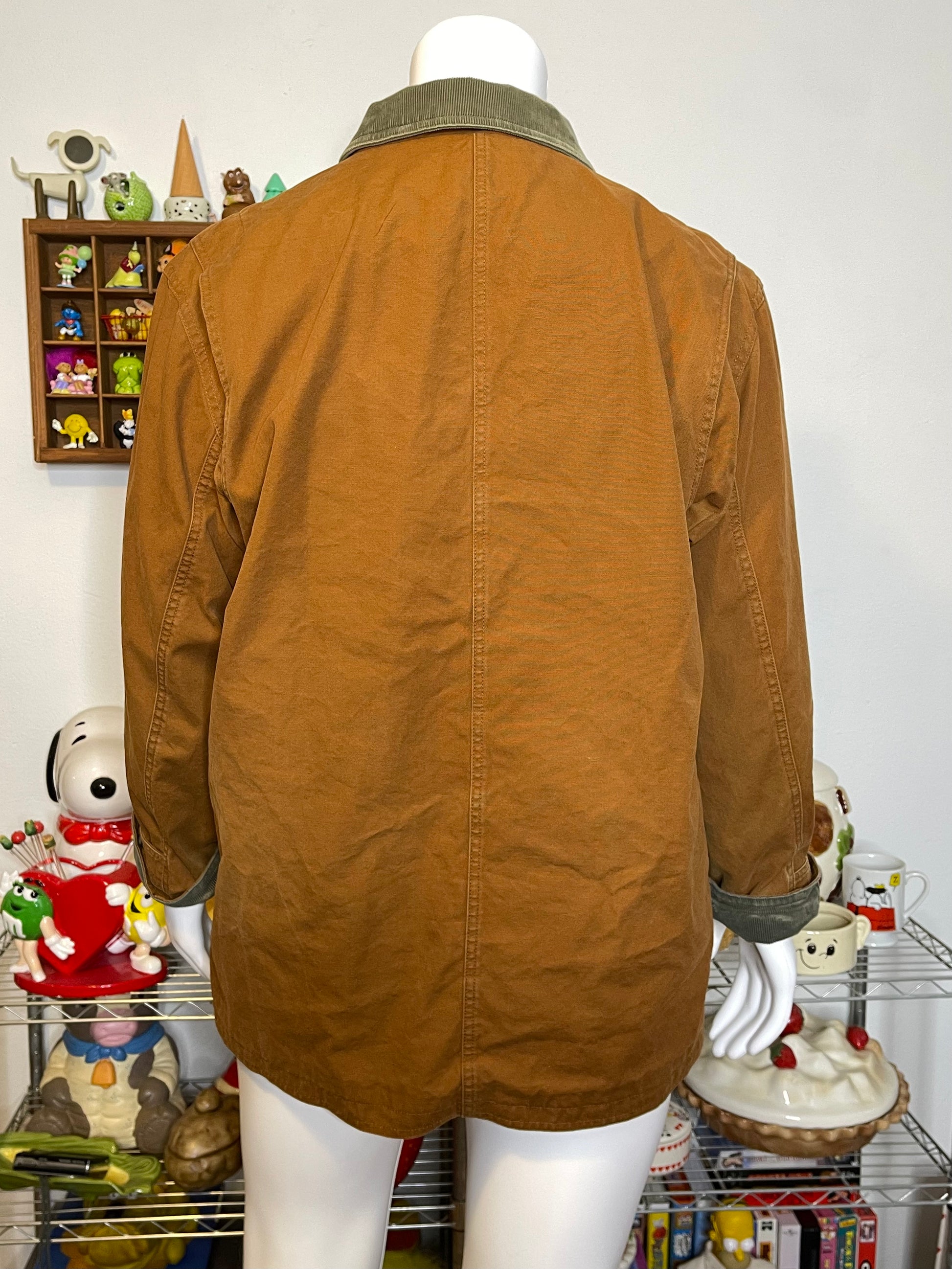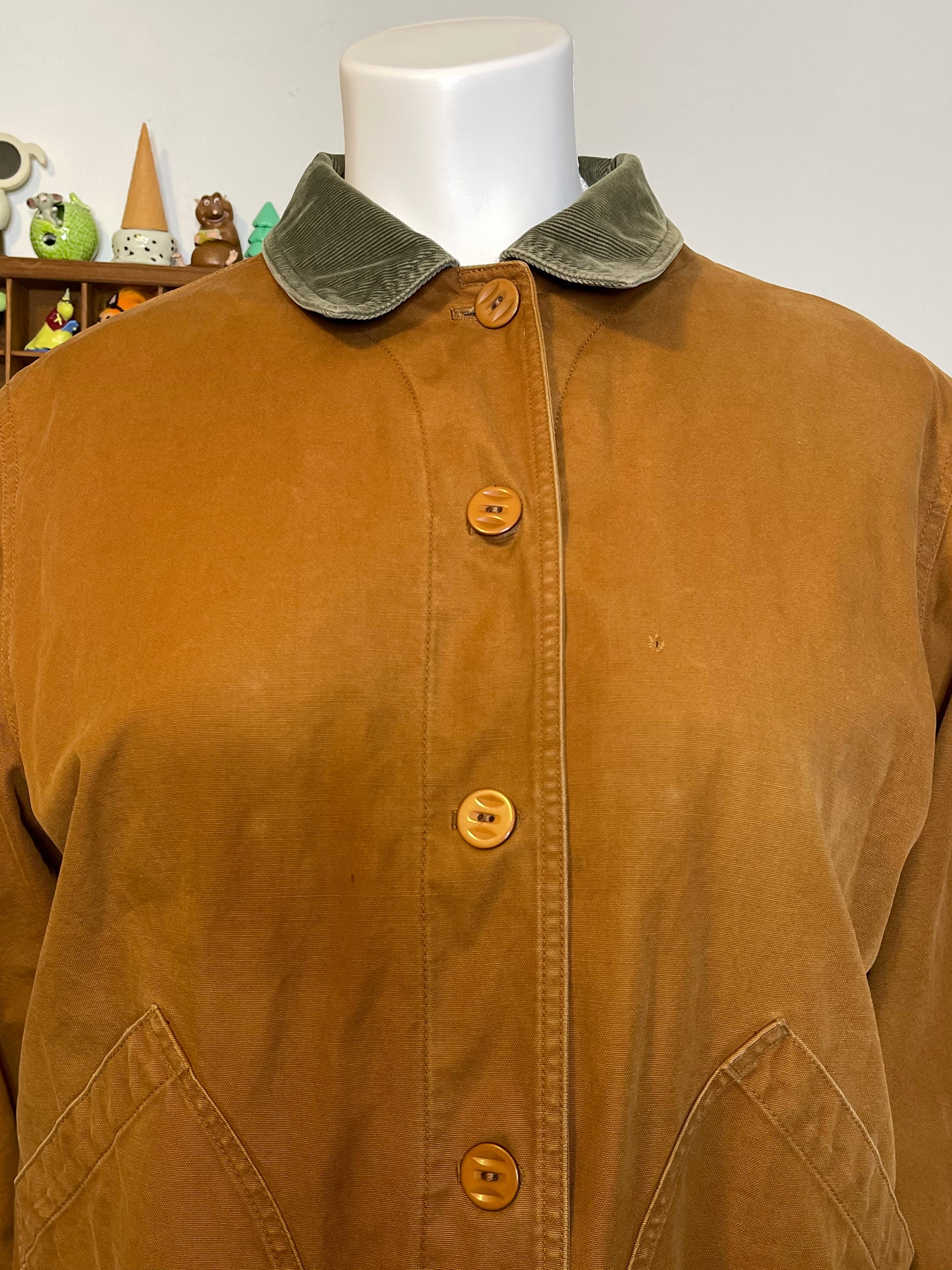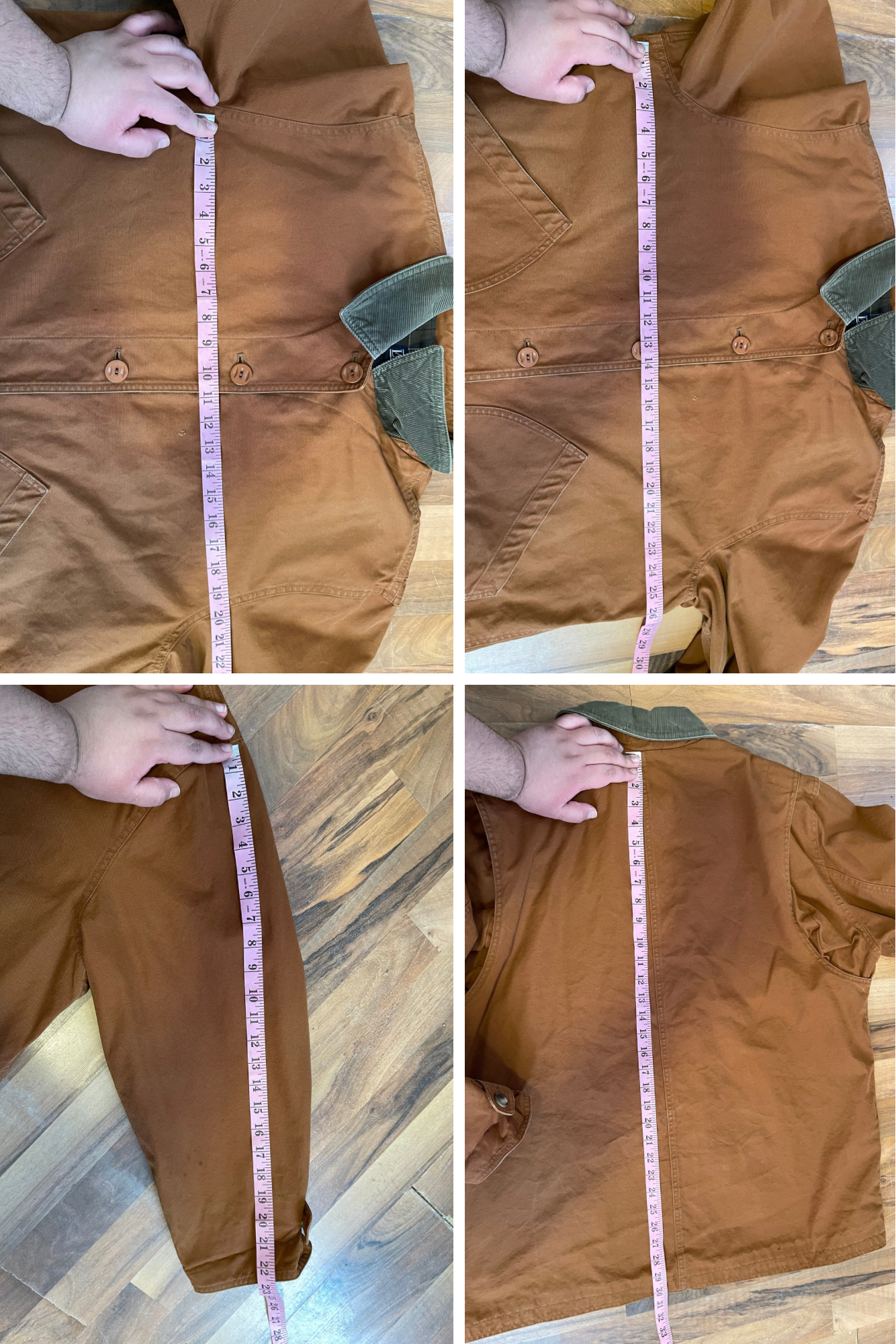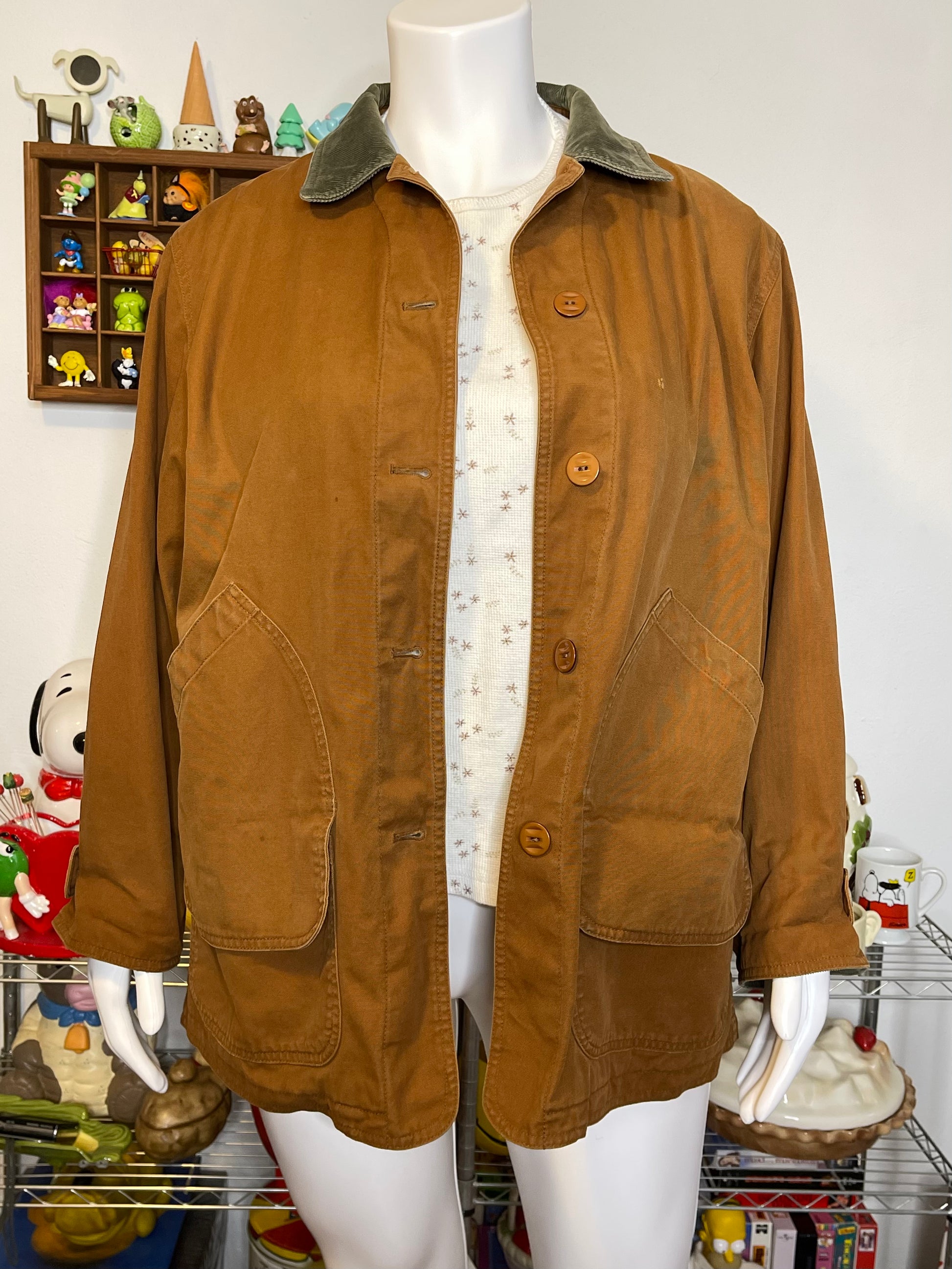 • This jacket is in worn and "flawed" condition, its worn and faded. The jacket also has several small dark stains, the front of the jacket also has a small hole/snag. The corduroy on the cuffs have a lot of wear, holes and distressing. The back of the jacket has a pen mark? The jacket was missing several buttons, so I replaced all the buttons on the front. The buttons on the cuffs do not match the front buttons.