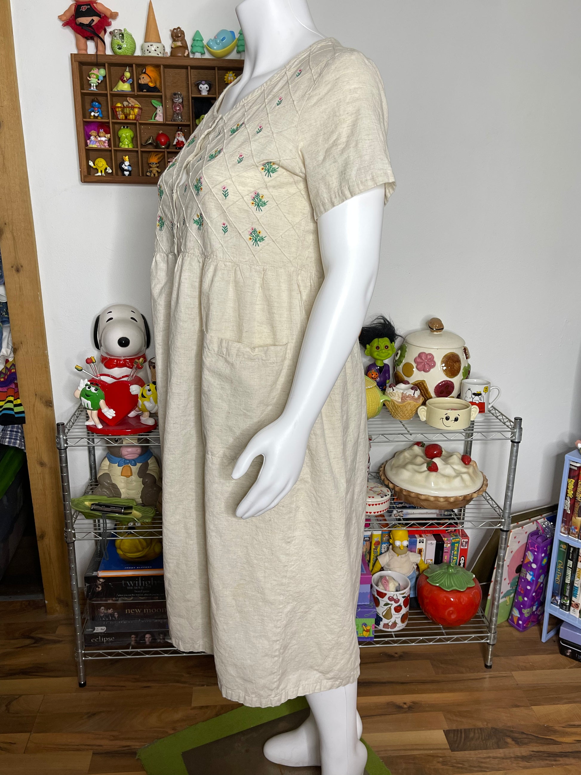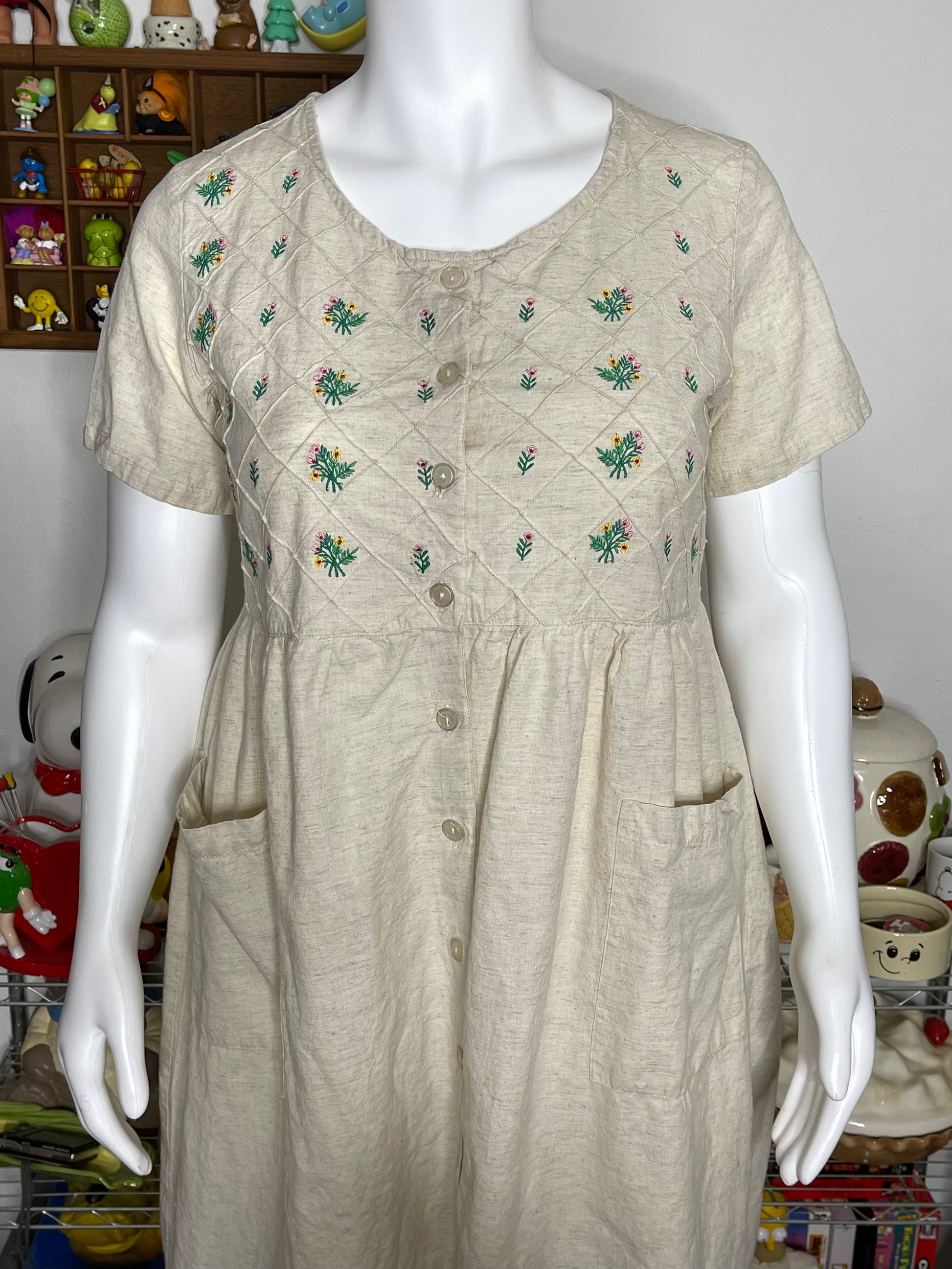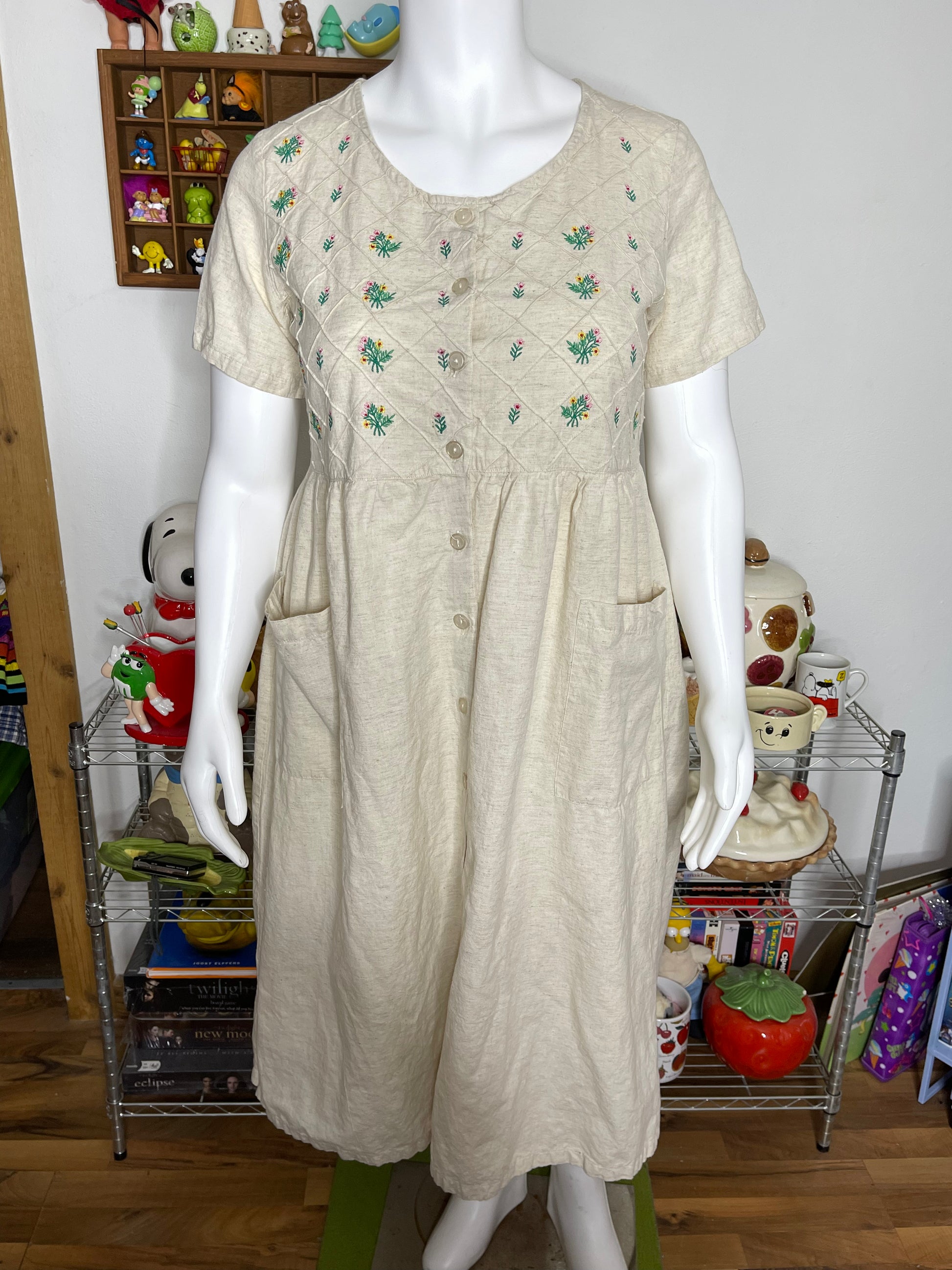 Vintage Flower Embroidered Linen Blend Maxi Dress Sz L