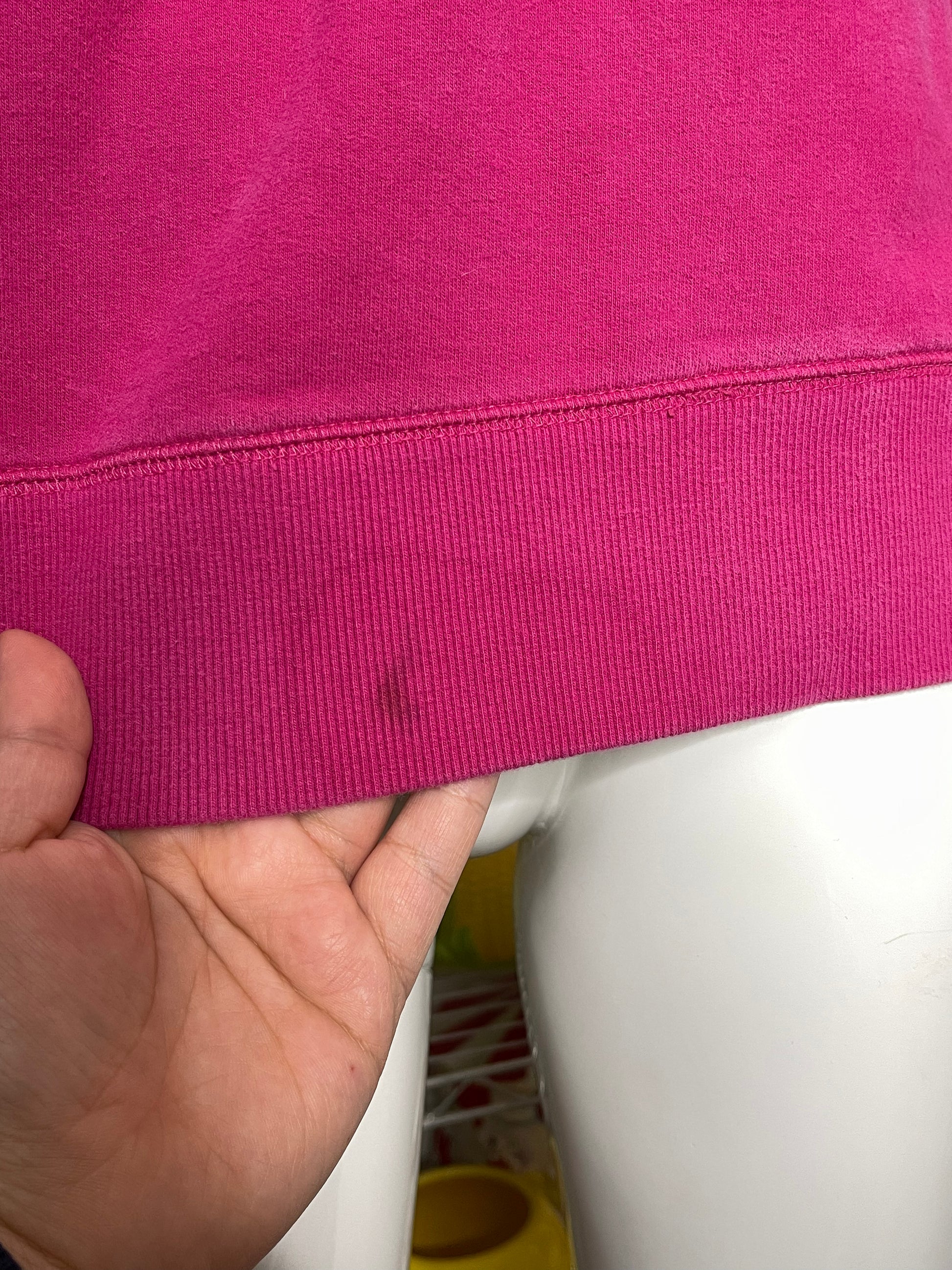 • The sweater is in preloved / worn condition. It has fading & discoloration all over. (more noticeable in person) The sweater also has a noticeable stain on the front, near the bottom band. The fabric also has pilling through out the fabric. (Please look at the photos.)