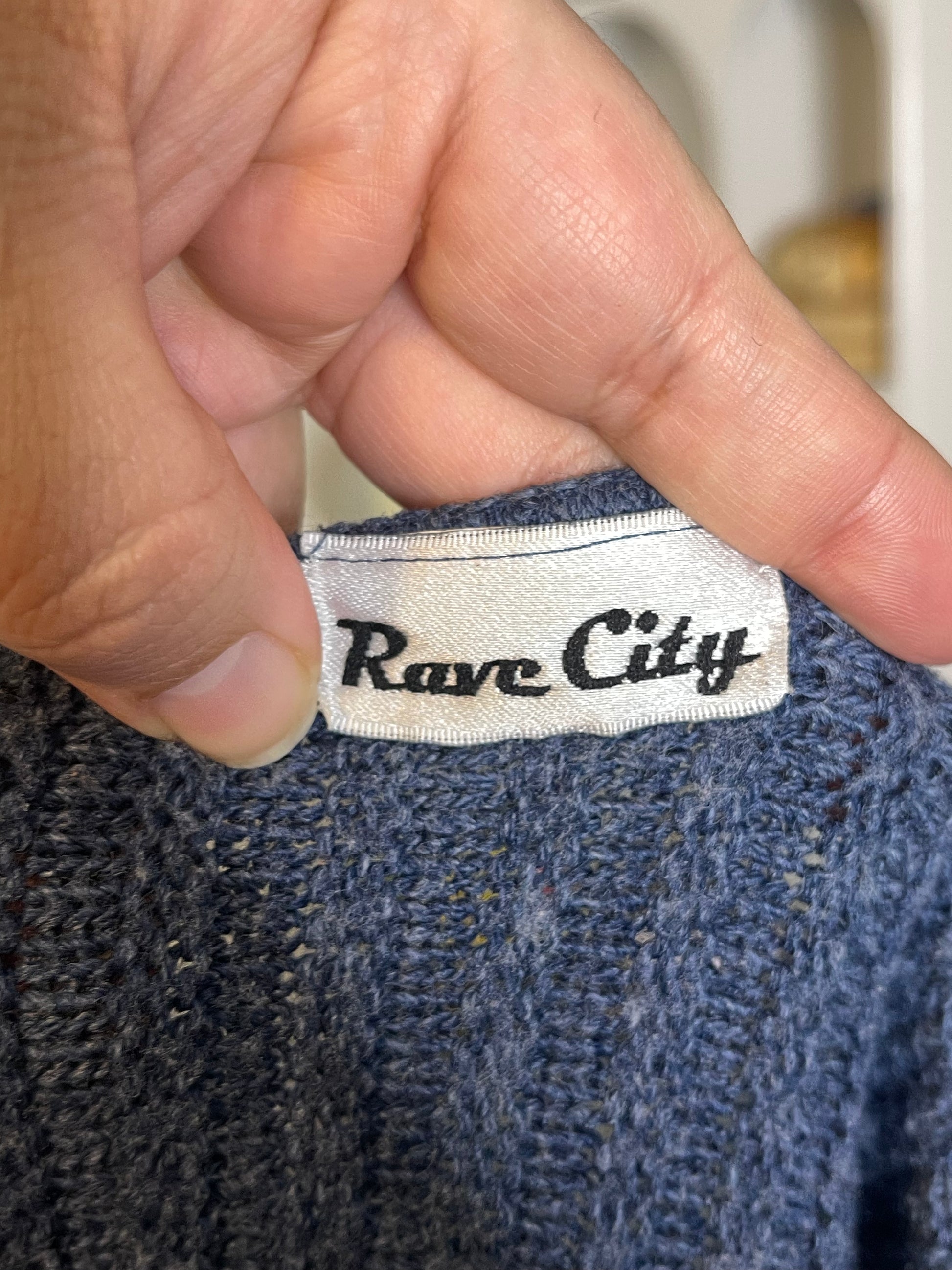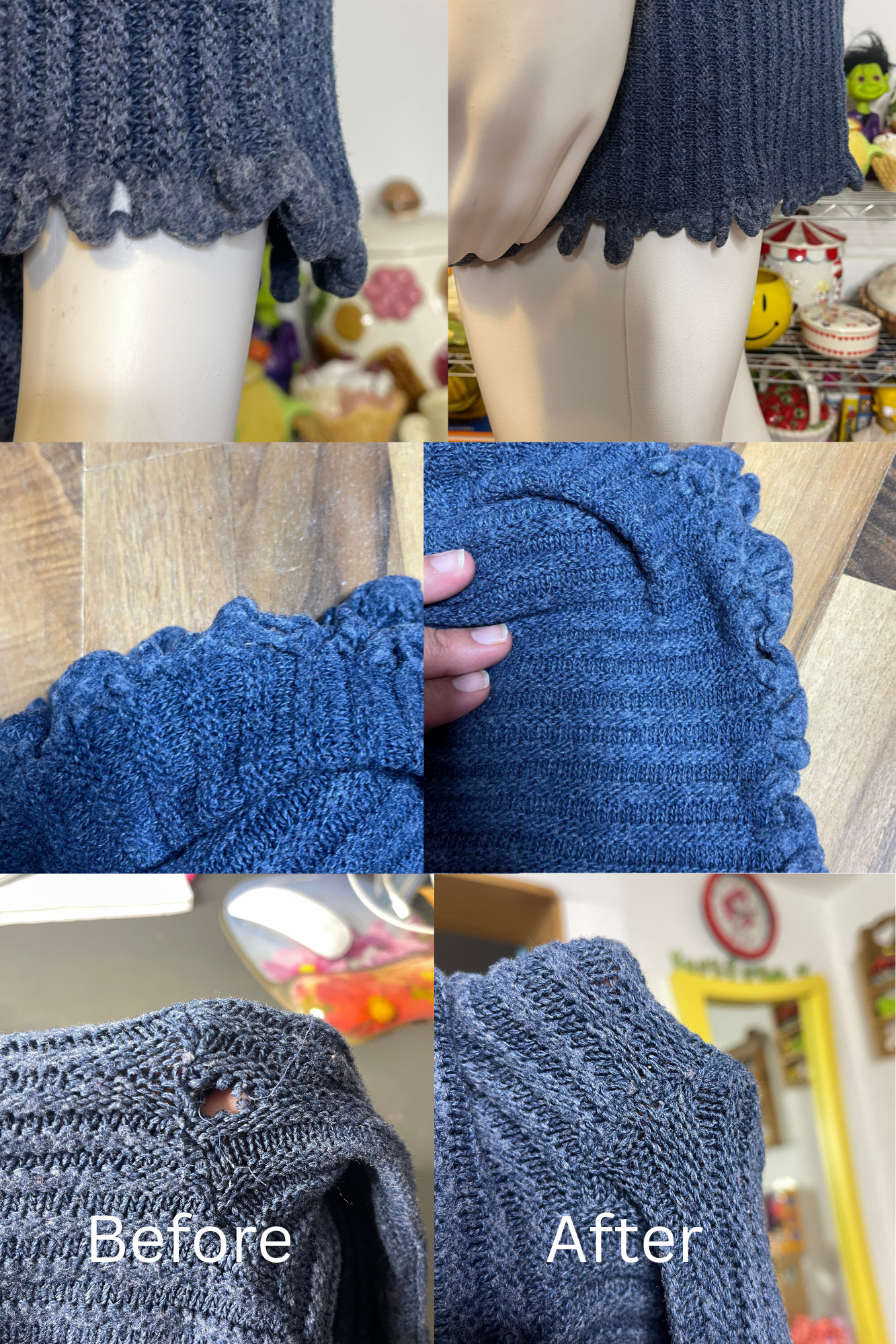 • The knit has some stretch. In very worn and faded condition, the cardigan has scuffs, snags, pilling and tons of white fuzziness all over. The under pit had a hole but I fixed it, please see all photos.