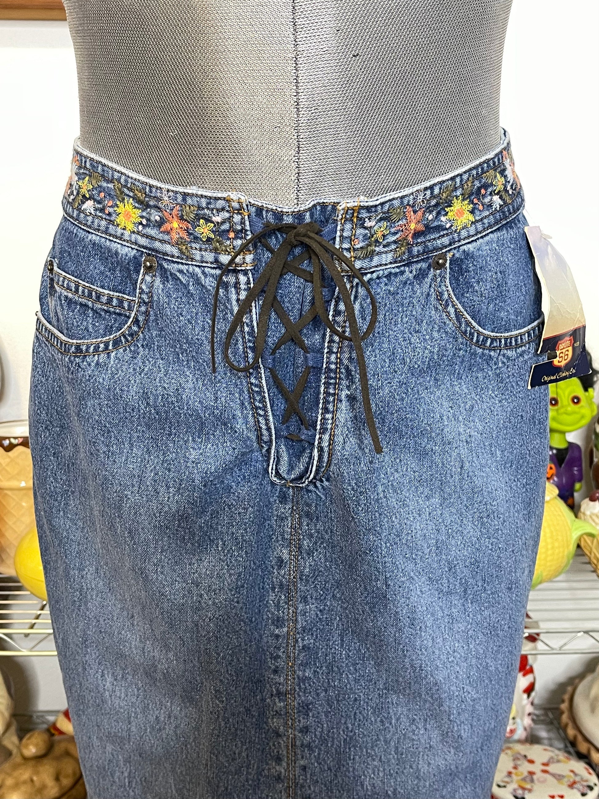 2000s Deadstock Flower Embroidered Lace Up Denim Maxi Skirt