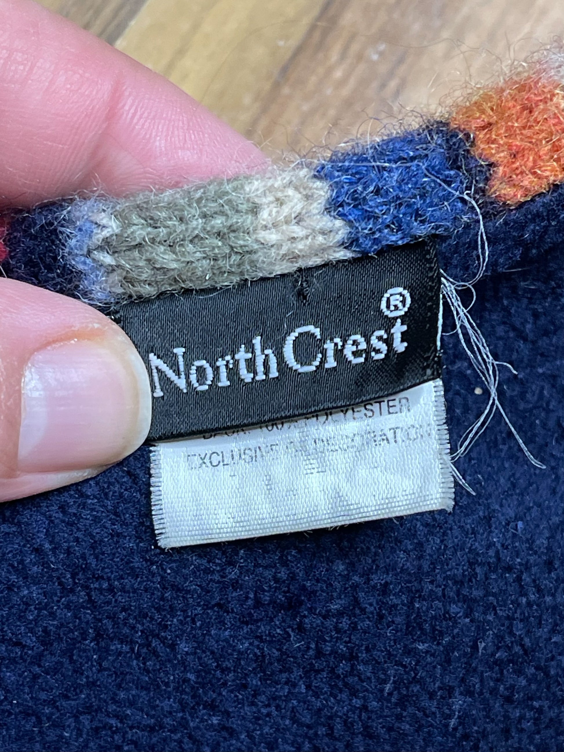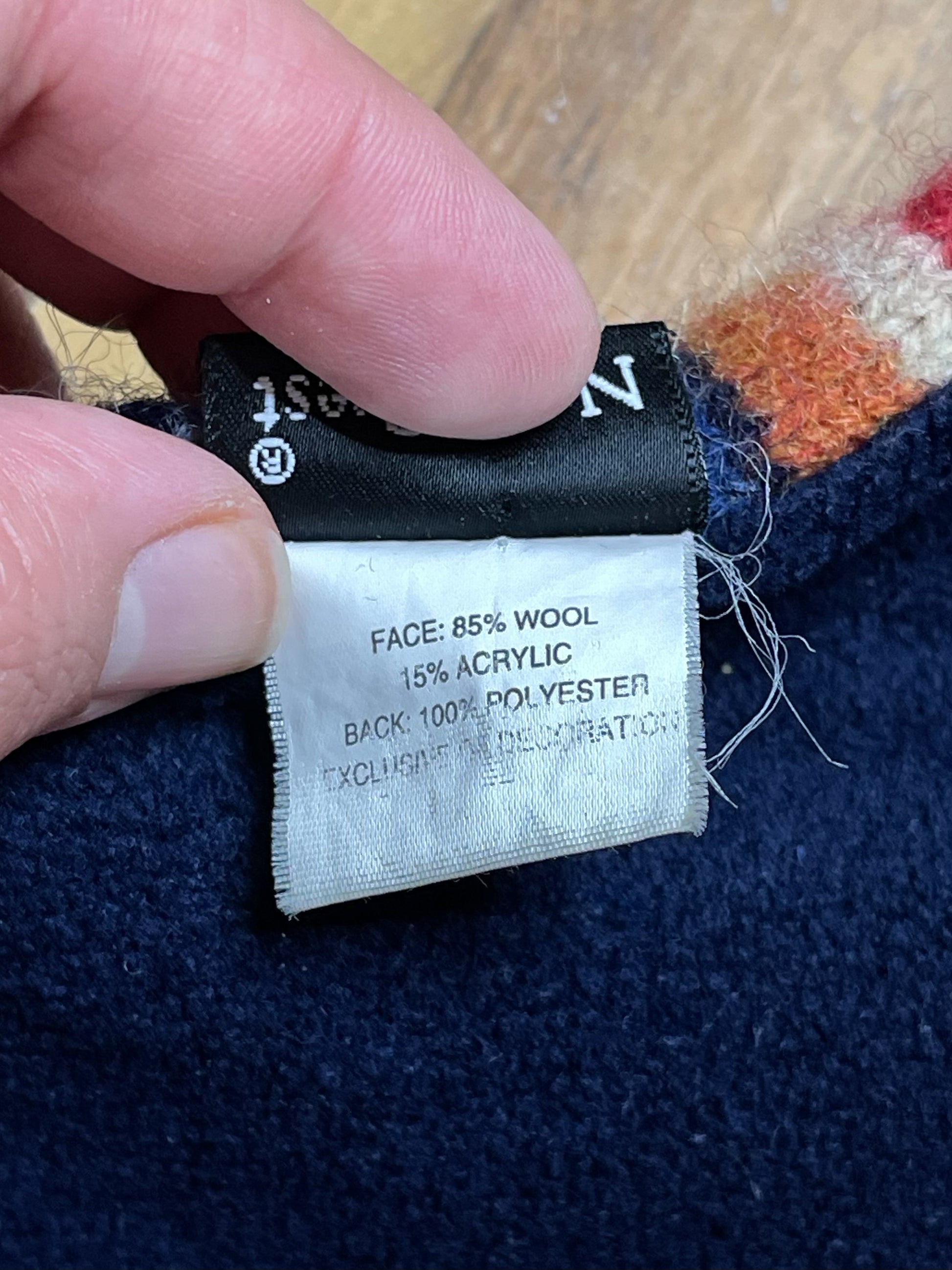 • Not plus size friendly. In preloved worn condition. Has pilling and worn areas. The inner fabric is a navy blue fleece. Light weight, perfect for layering.