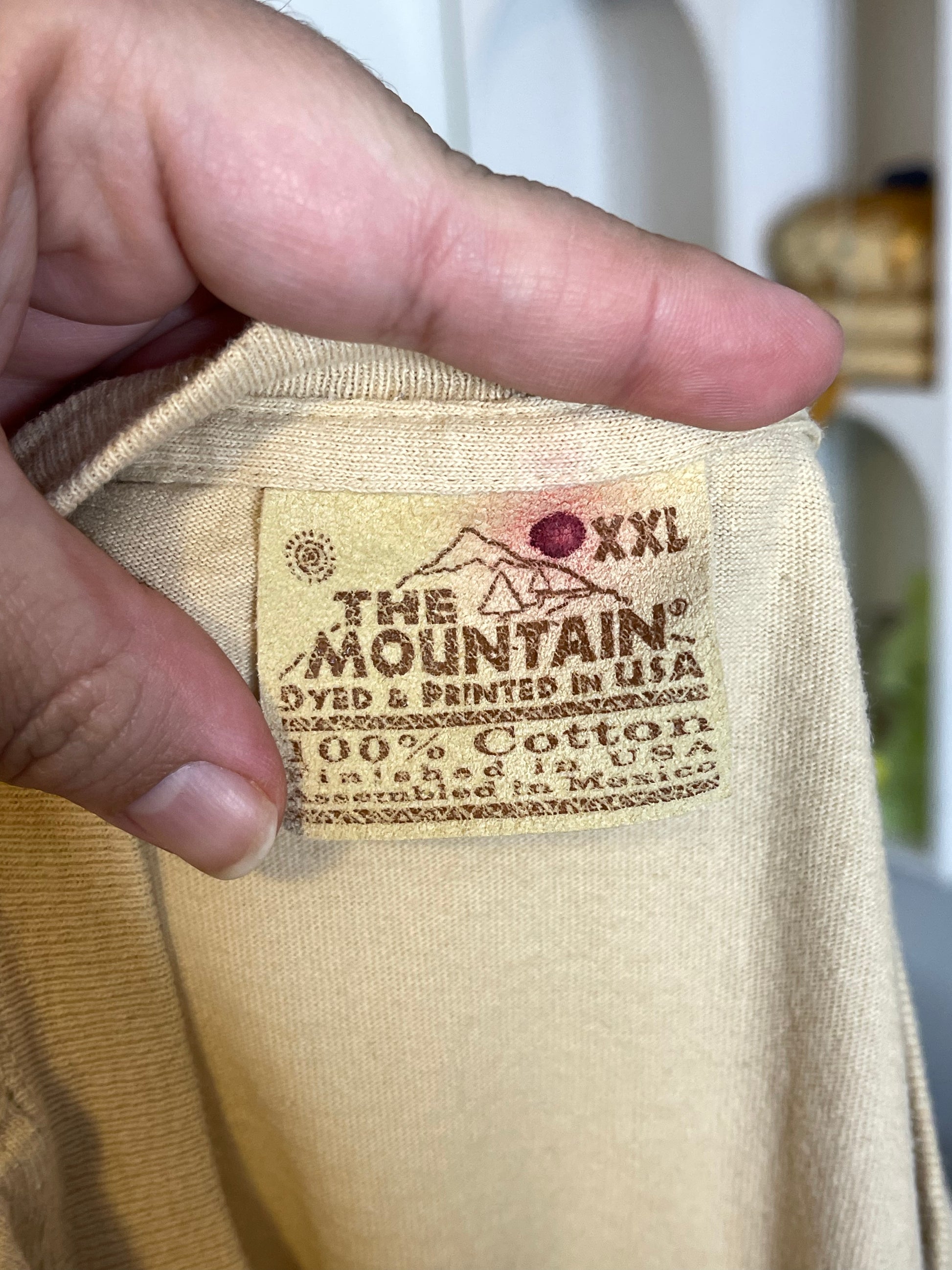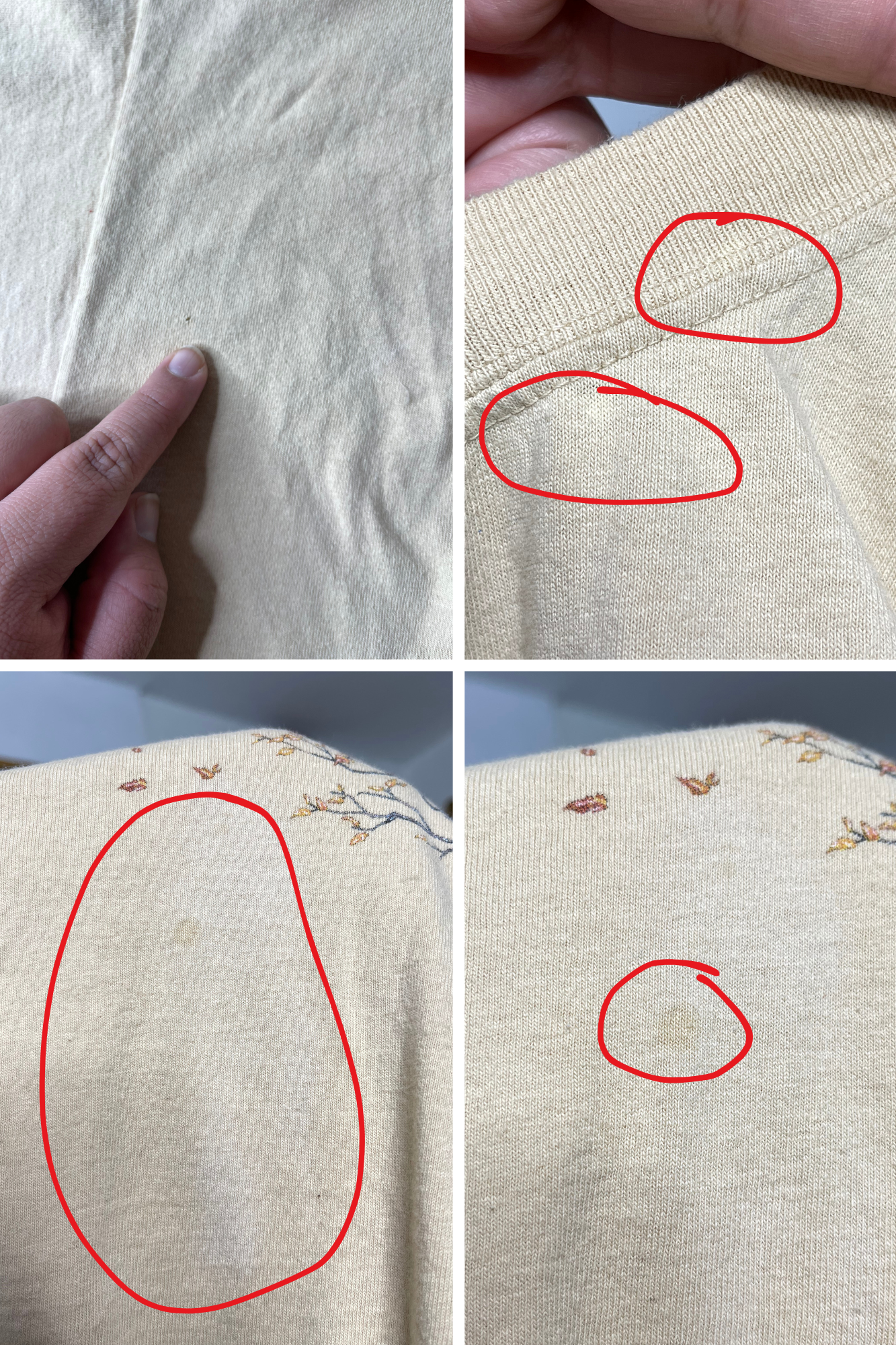 • This tee is in preloved condition, it has a bit of wear. The tee has a small hole near the pit, it also has several dark yellow stains. It also appears to have small bleach stains near the neck line. The front of the tee also has these light "stains", i'm not sure if its sun fades or bleach. Please look at all the photos.