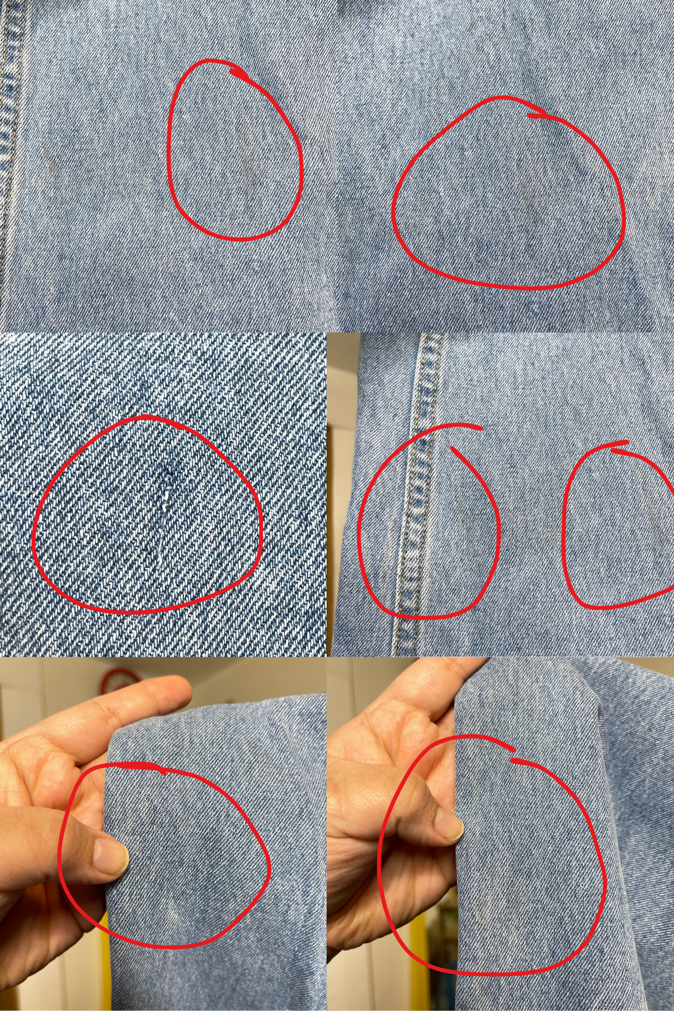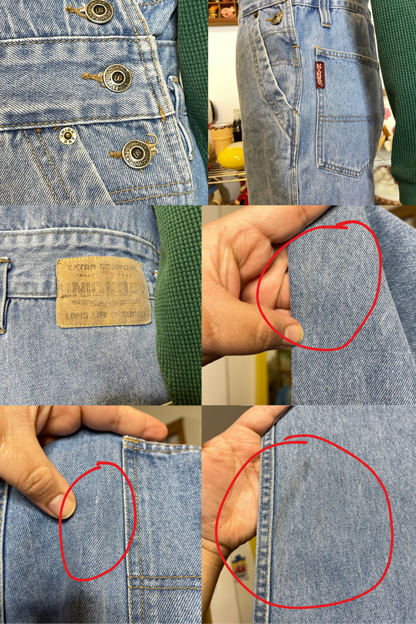 • In vintage preloved & "flawed" condition, the denim has wear, discoloration, stains & scuffs. The legs have several dark stains that I was unable to remove (on front and back), the back tag is really worn and faded as seen in the photos.