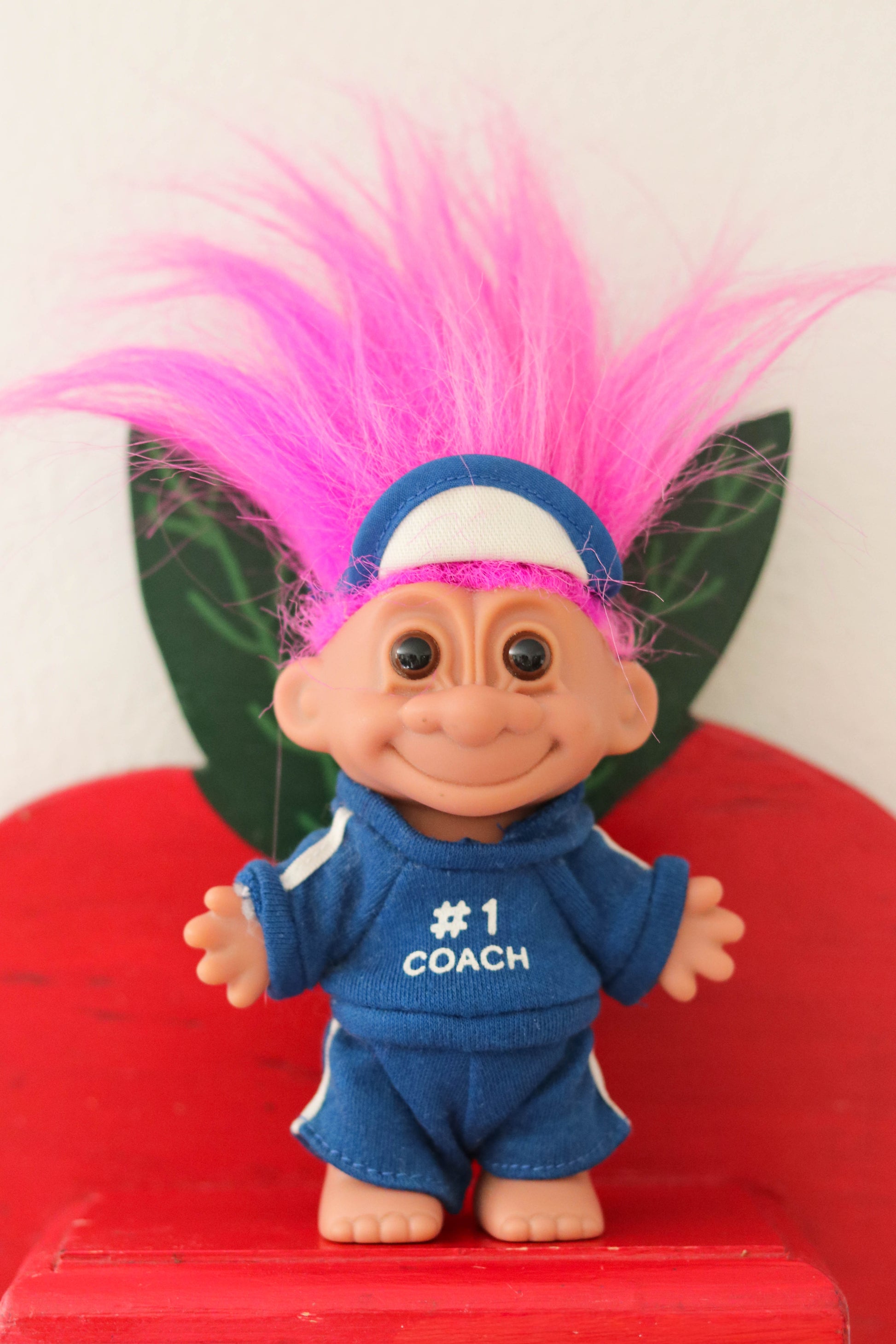 • The troll is wearing a track suit, hat & has bright pink / purple hair