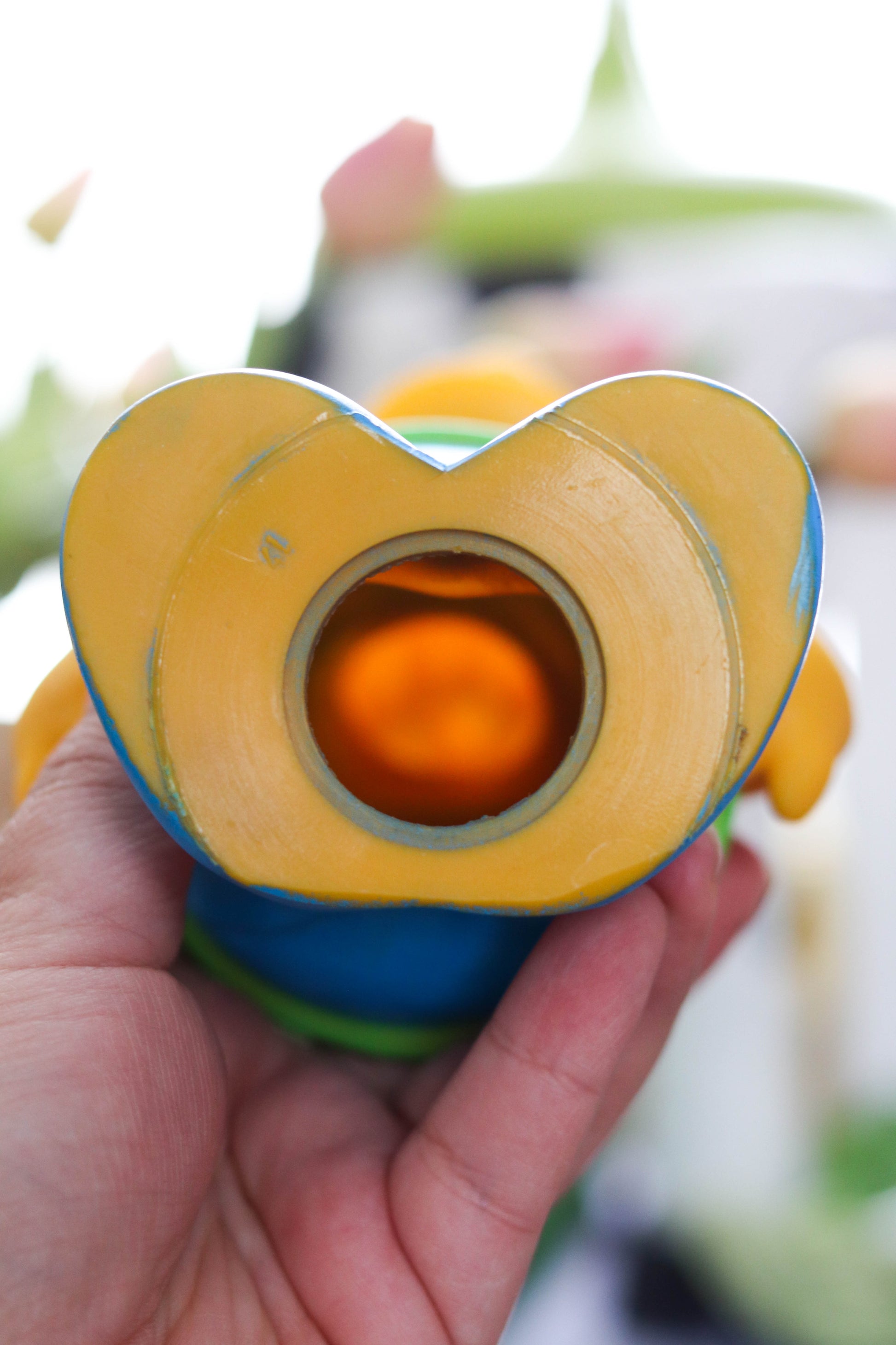 • In vintage preowned condition, it has scuffs, paint chipping and marks. The bottom black cover is missing, it will either need a new one or to be taped shut if you want to use it as a piggy bank. I also cleaned it the best that I can, the inside of it has some dirt that I was unable to remove. Please see all photos.