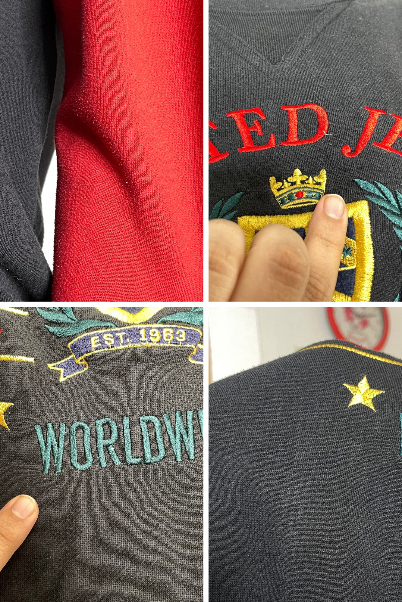 • This top is in preloved worn condition, its faded and has tons of pilling throughout the fabric. The embroidered area has some scuffs, the front of the sweater have some white staining.