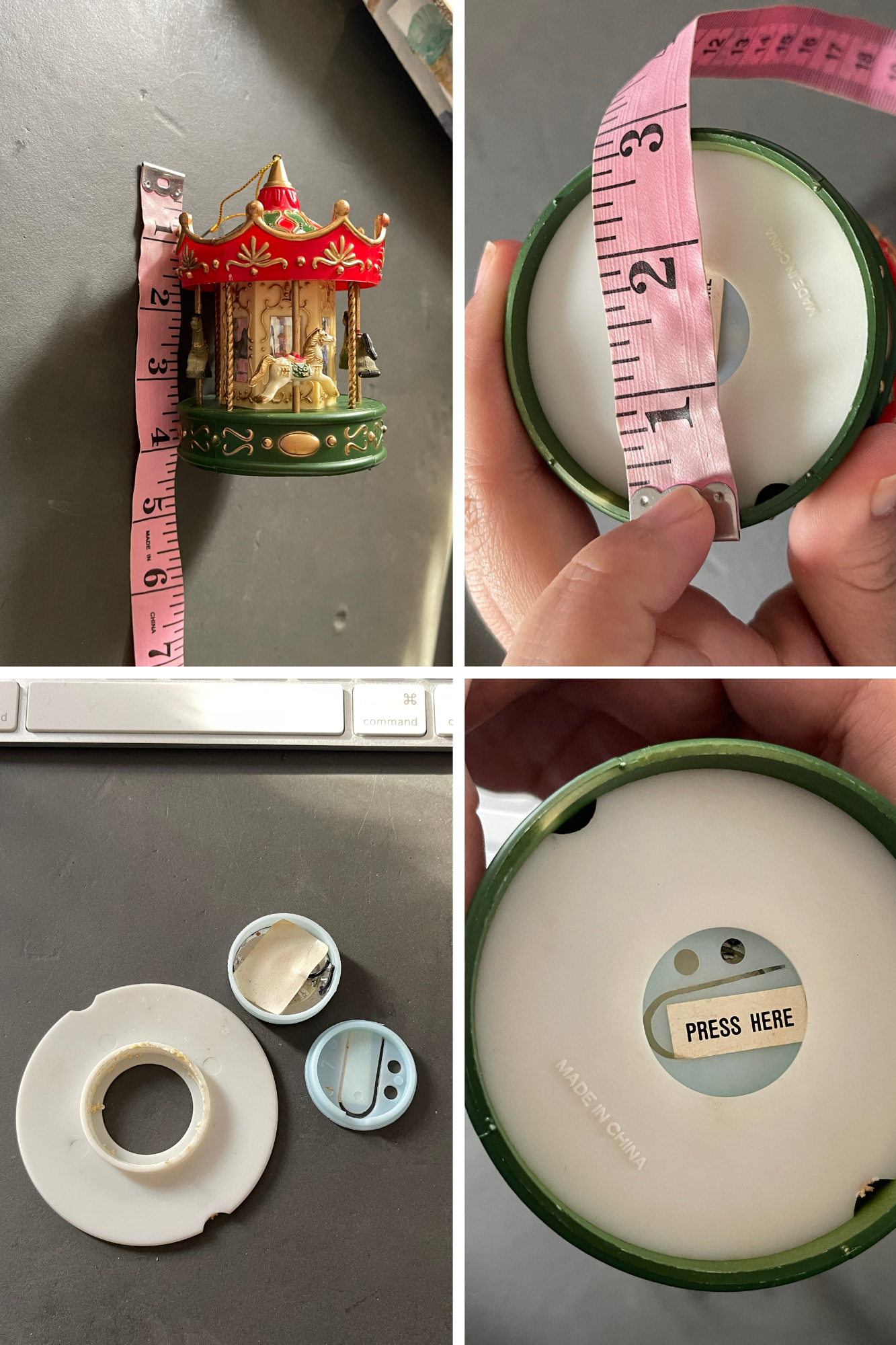 • The ornament is supposed to spin, but that doesn't work anymore. The battery wires were cut.
