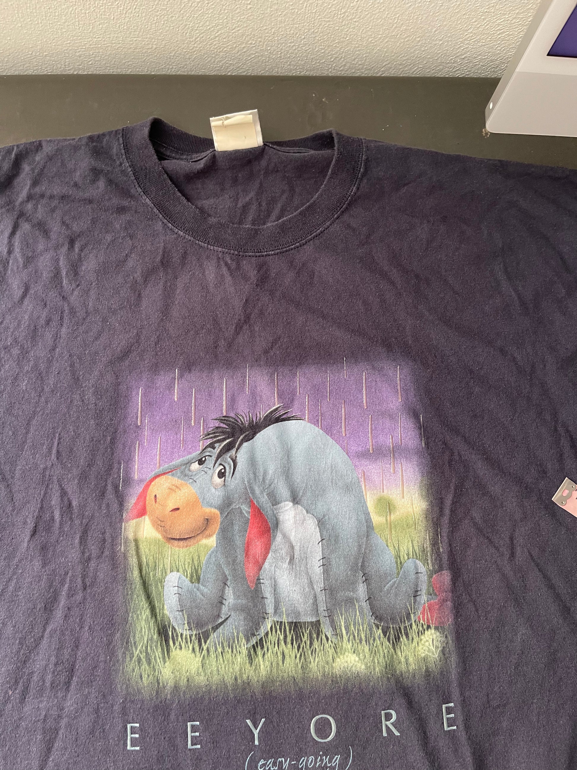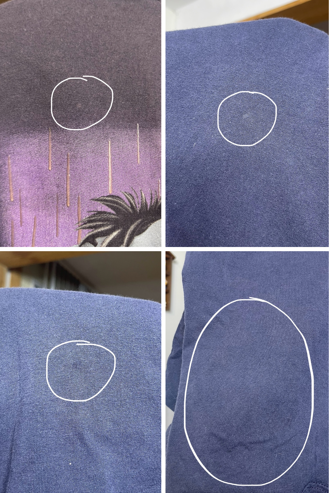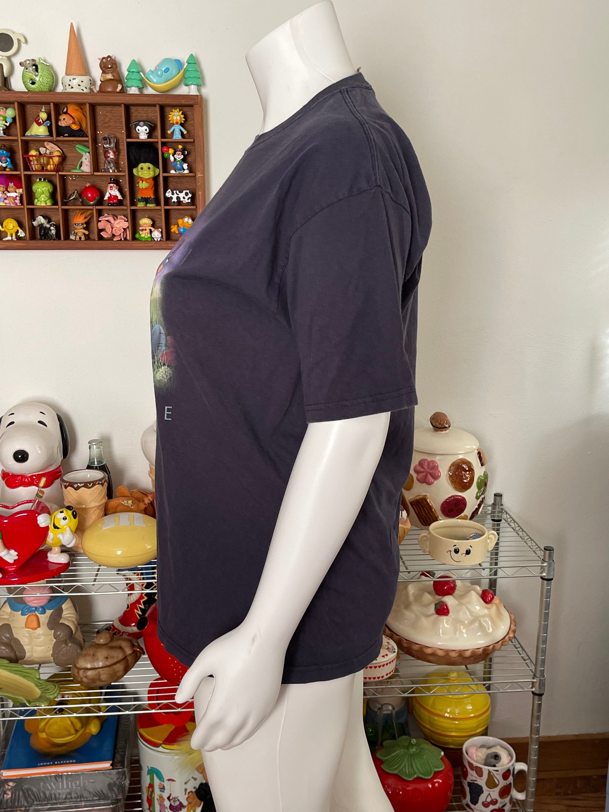 • This tee is in worn & faded condition. It also has discoloration and pilling throughout the fabric, the tee also has several dark stains. The artwork also has some cracking.