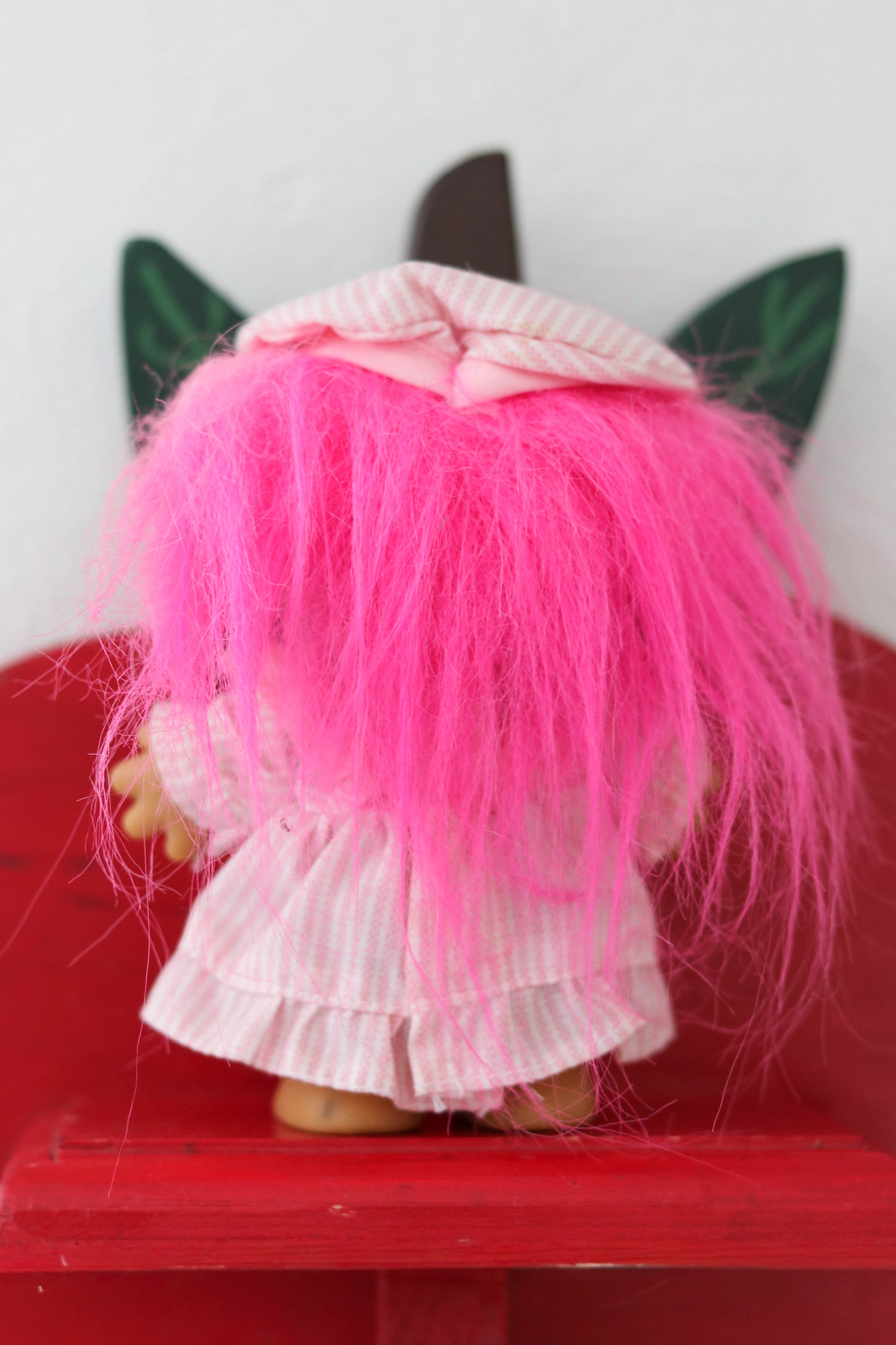 • The troll is wearing a pink striped dress with a pink bow + matching hat. She has neon pink hair.