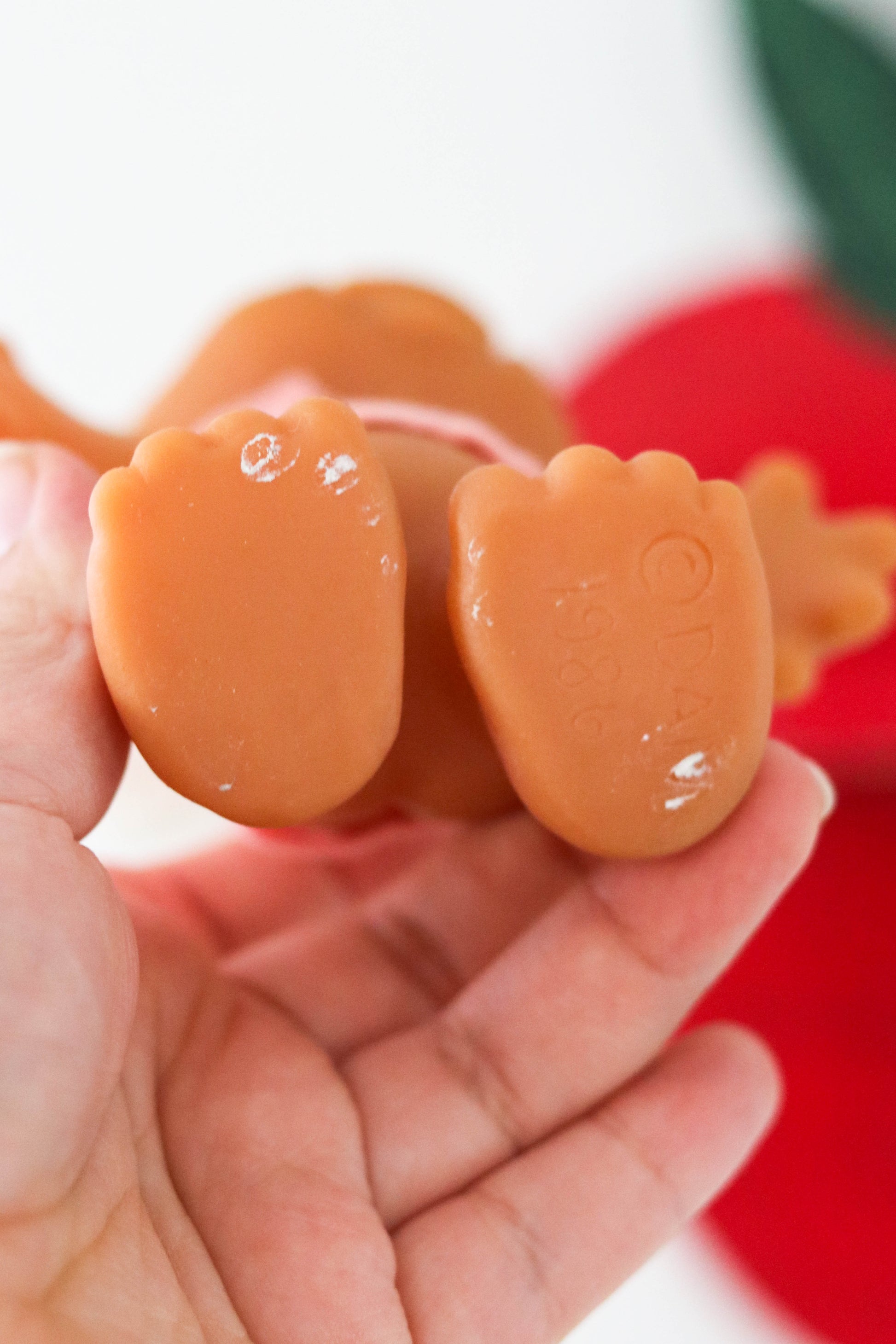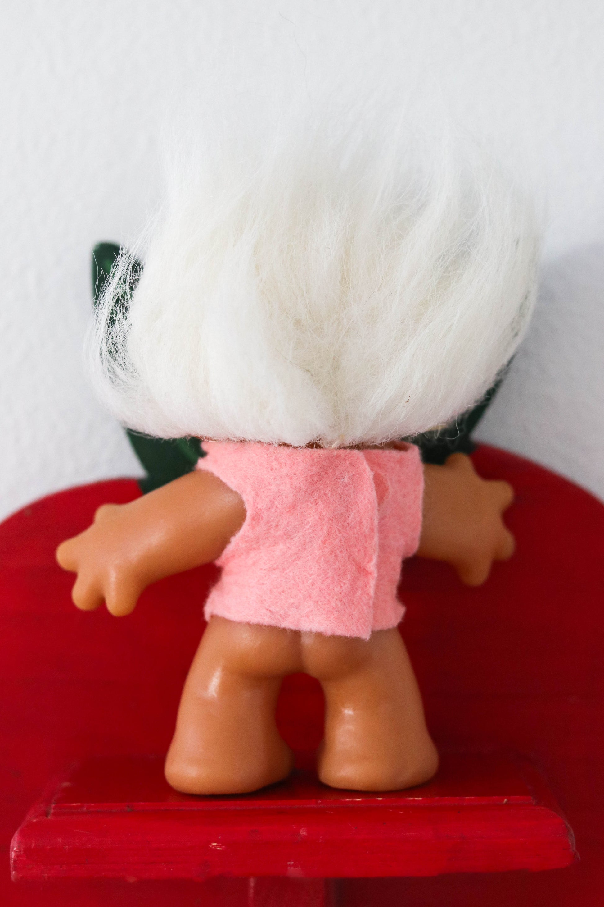 • In vintage / "flawed" condition, the toll was super dirty but I hand washed it (before photographing). The troll's hair was / is lifting but I glued it down the best I could, the hairline has some crusty yellowing areas. The bottom feet of the troll has white paint stains.