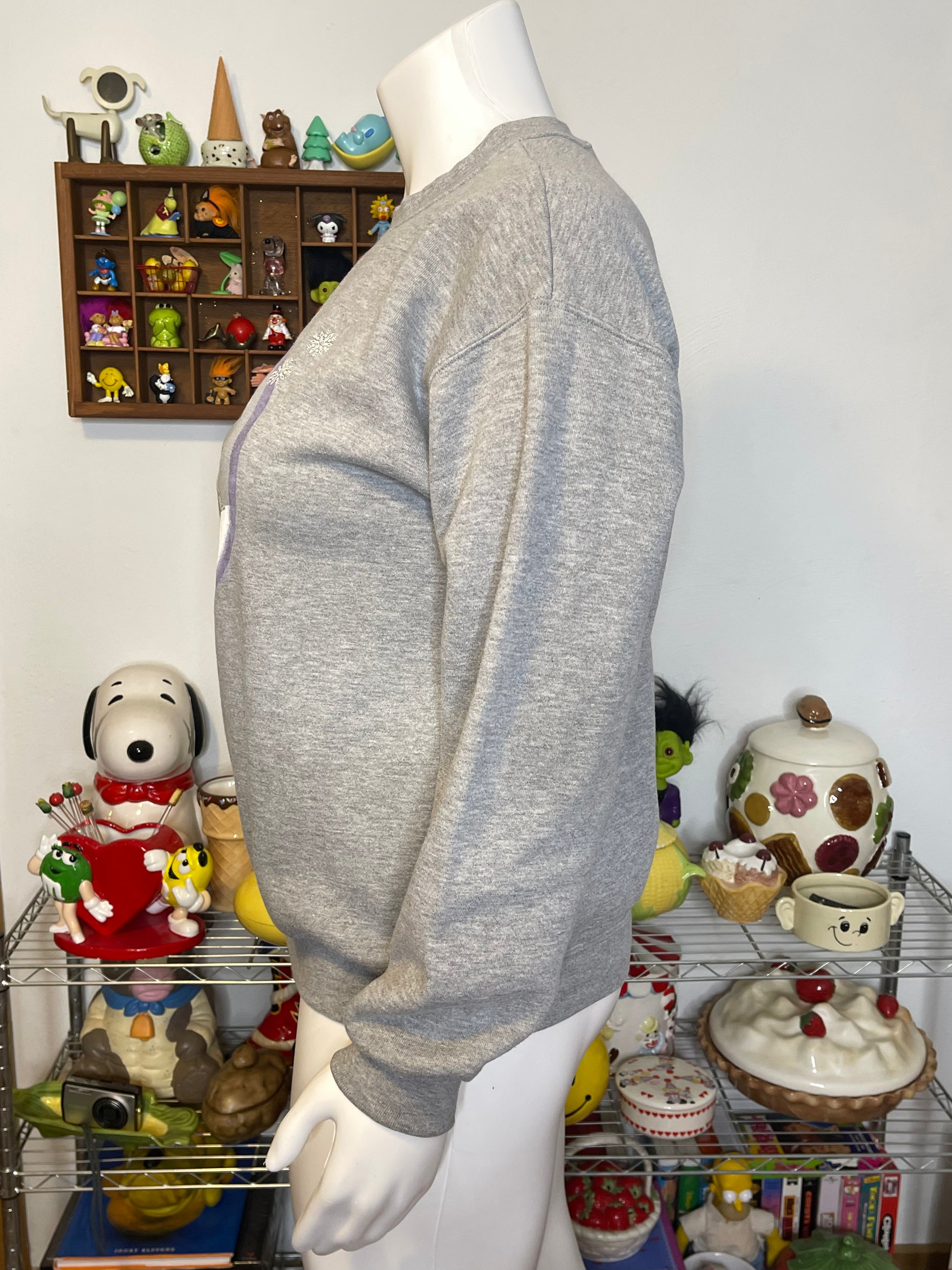 • This sweater is in vintage / preloved condition. It's worn and faded, has pilling throughout the fabric. It also has small yellow stains (on the back sleeve & on the back of the sweater). The artwork also has some cracking and wear.