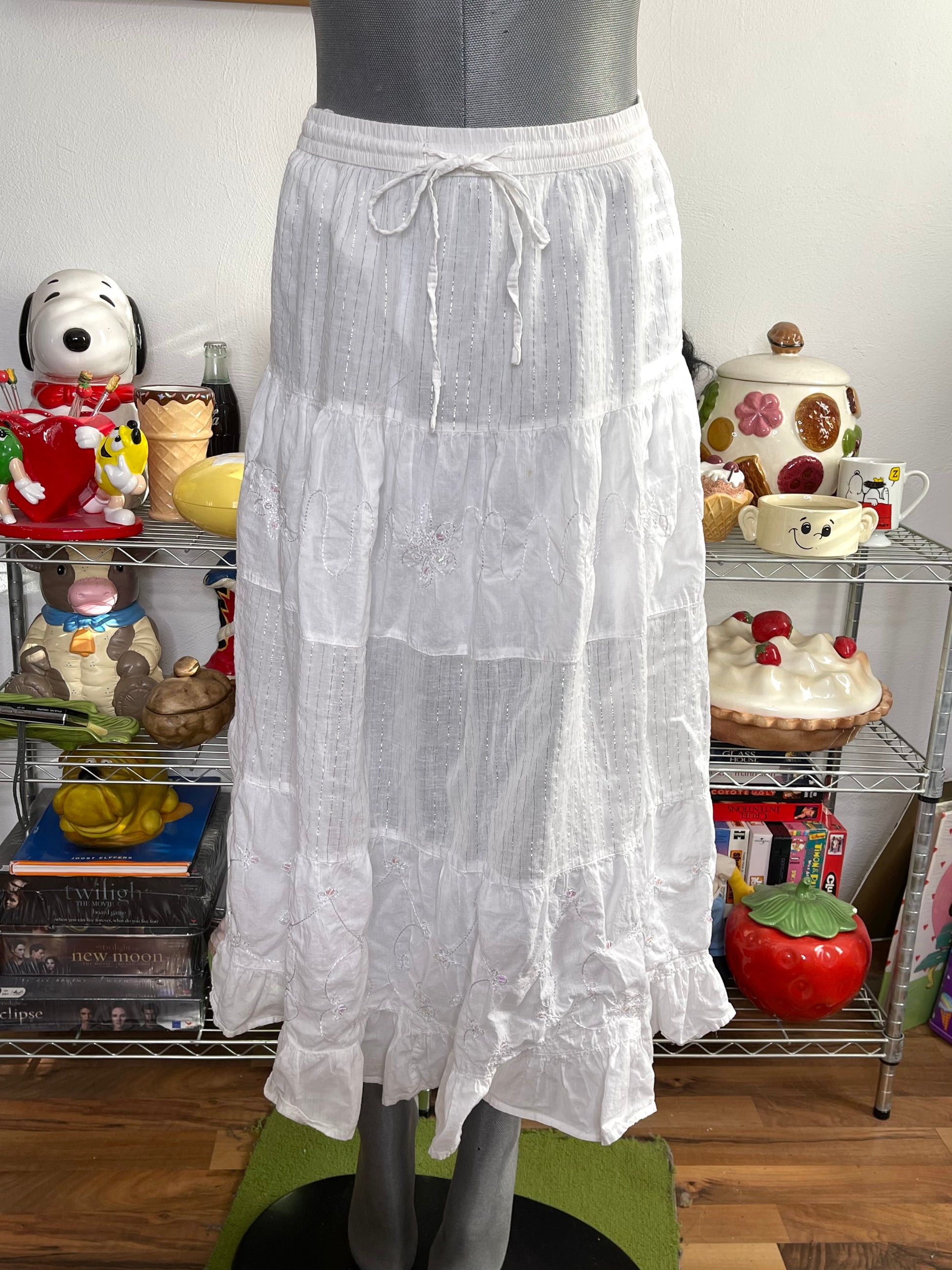 2000s White Sheer Sequin Tiered Midi - Maxi Skirt Sz M/L