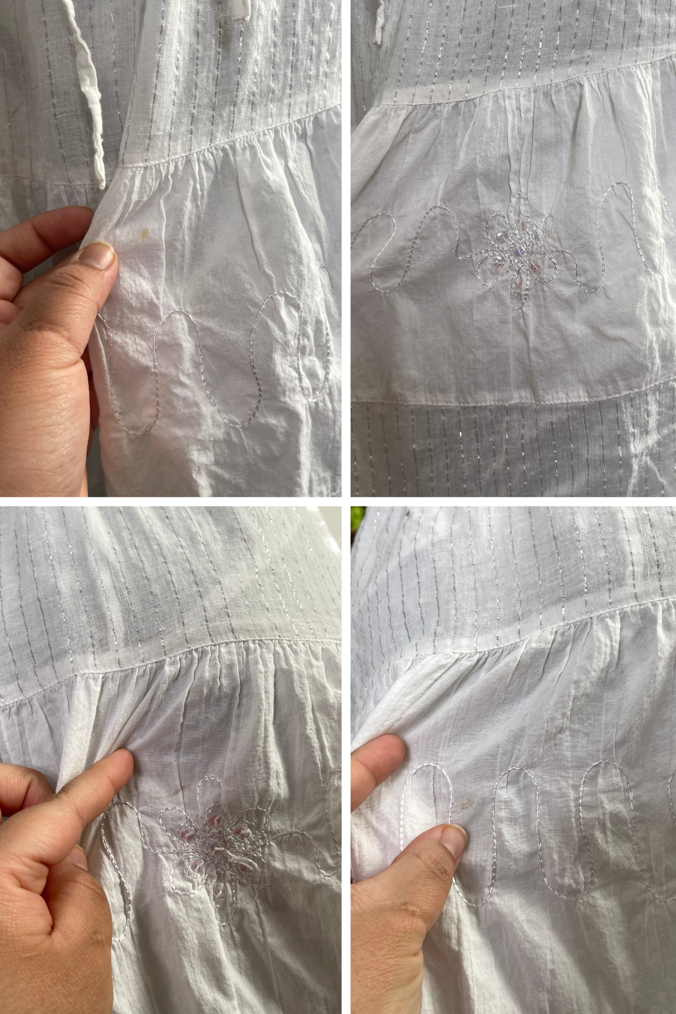 • Light weight, thin / sorta sheer fabric, the waist is stretchy. The skirt is in preloved worn condition, it has scuffs, snags and several dark stains, 2 small ones on the front and bigger ones on the back. I was unable to remove the stains.