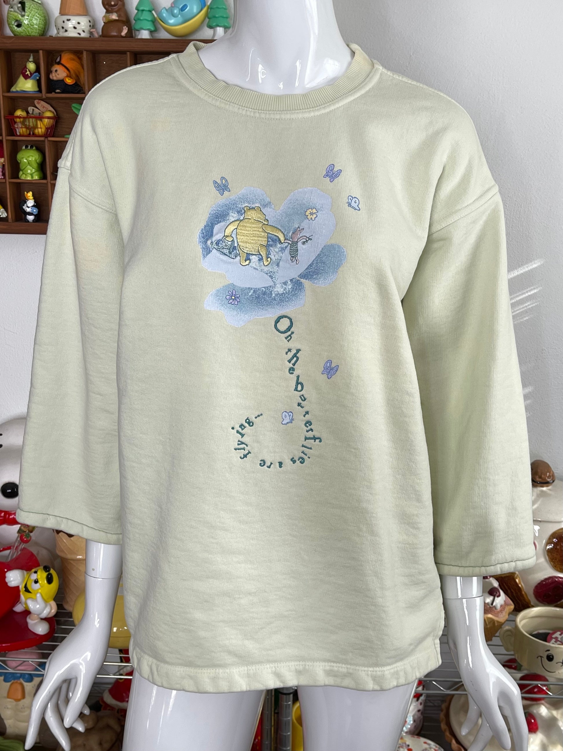 • From the 90s, "oh the butterfiles are flying", pale green color. The sleeves are cropped. The sweater is flawed, please read description.