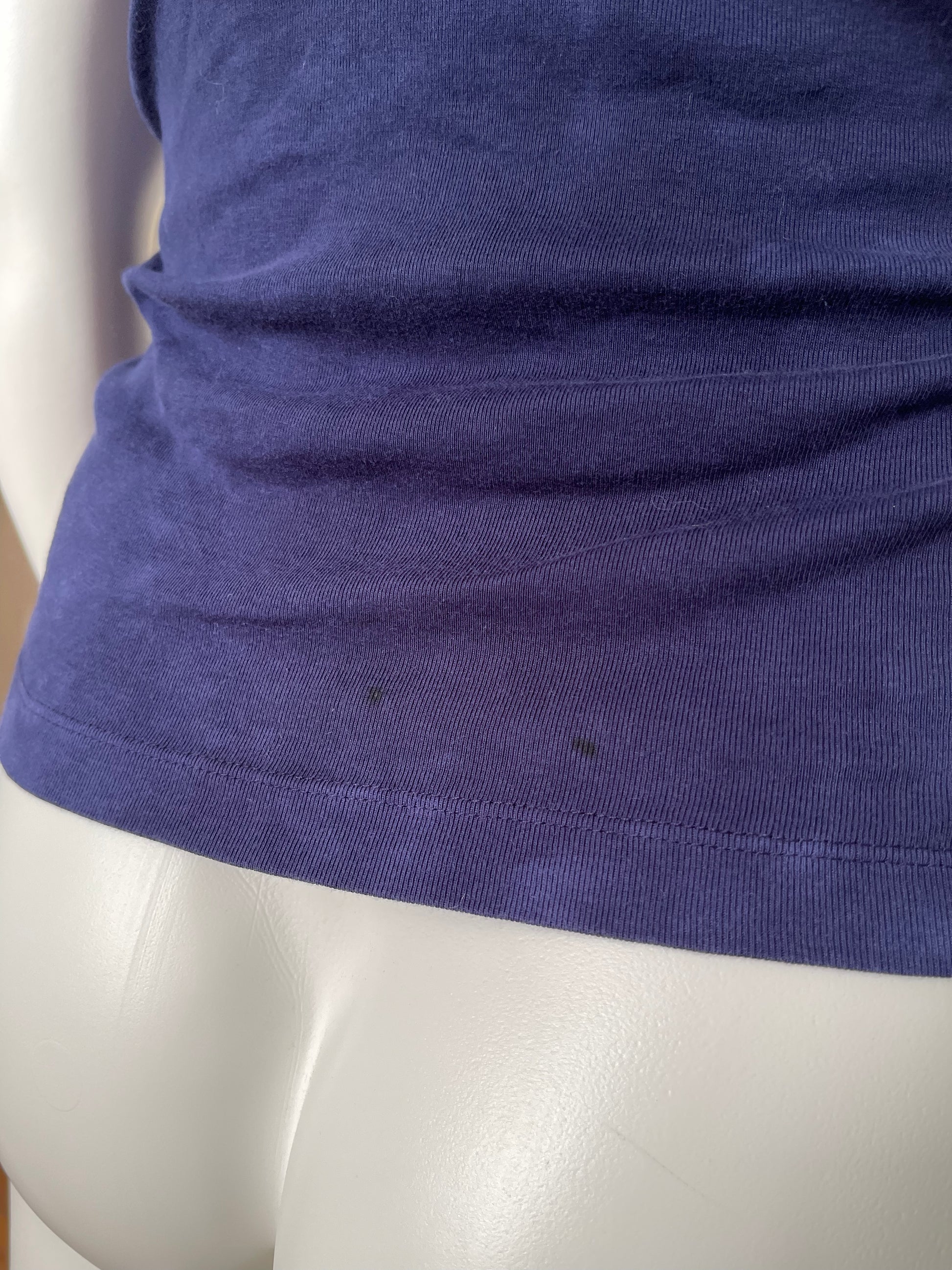 •This top is a dark blue / purple color, its new without tag! The size tag has some sticker residue. The tank top does have some flaws from storage. It has light scuffs and 3 small dark stains on the back. The front graphic also has some sun-fading due to storage, thats visible in the 2nd to last photo.